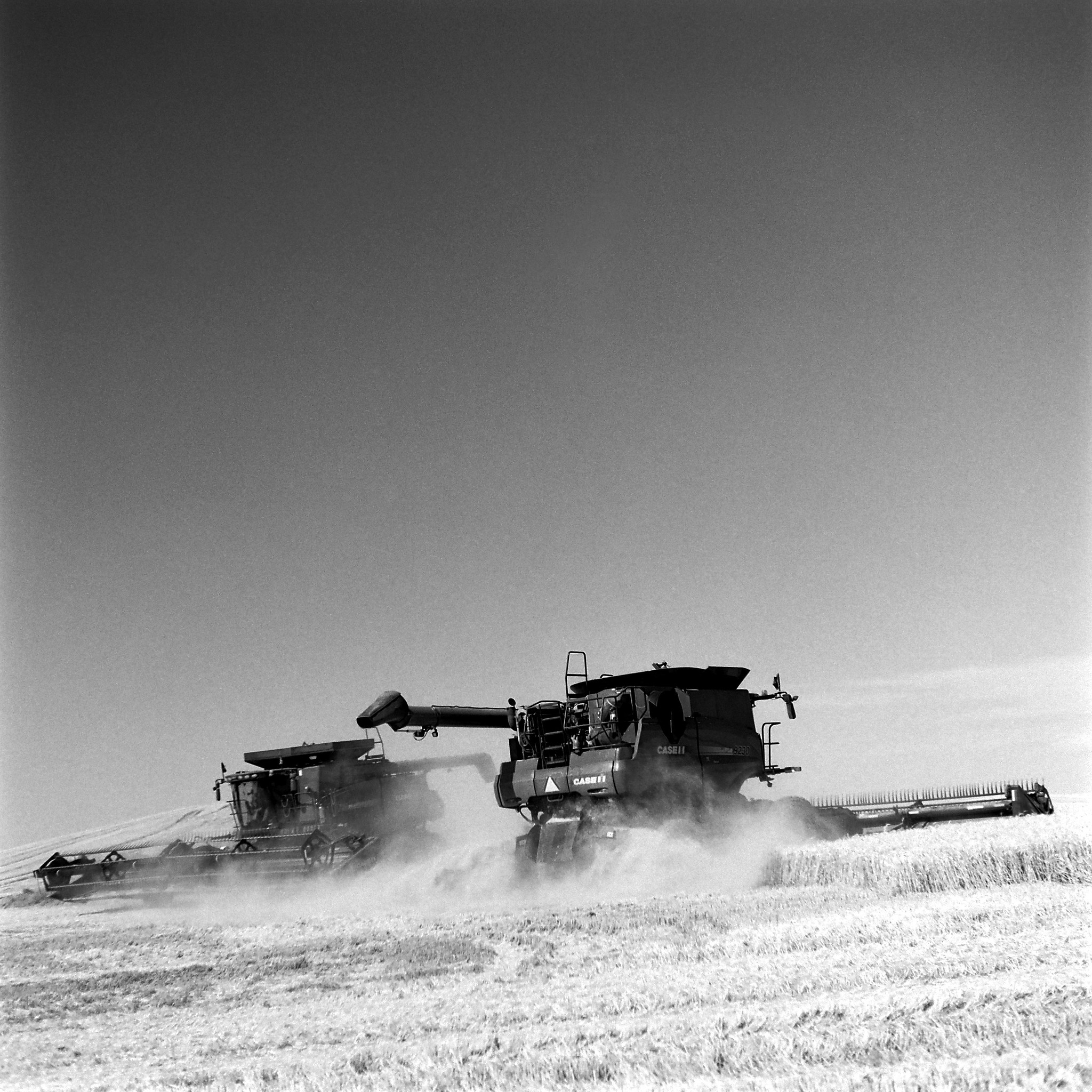 Wheat harvest somewhere in the Palouse of Washington state.<br /> <br /> Photographed with a Ricoh Diacord L with a Rikenon f/3.5 8cm lens using a yellow filter. The film is expired Agfa Agfapan APX 100 developed in Beerenol (Rainier Beer).