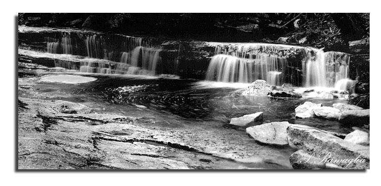 Minnewaska State Park, this is the low falls just above Awosting Falls. Taken with a 4x5 Pacemaker Speed Graphic on Kodak TMax 100 B&W film. 165mm Paragon Anastigmat lens in an Ilex #3 Shutter. 2 Second Exposure. This image was cropped from a 4x5 negative.