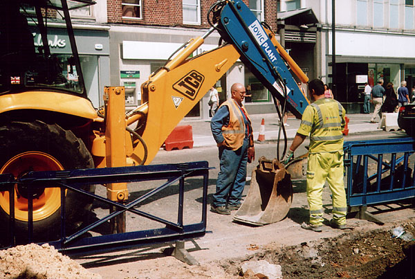 Leica 1934 : I saw the colourful yellow and blue of the High Street works -- thought it would be a good test of the 1936 f2 Summar lens. I used outdated Truprint 200 film rated down to 100ASA. Scanned from a 6x4" print.