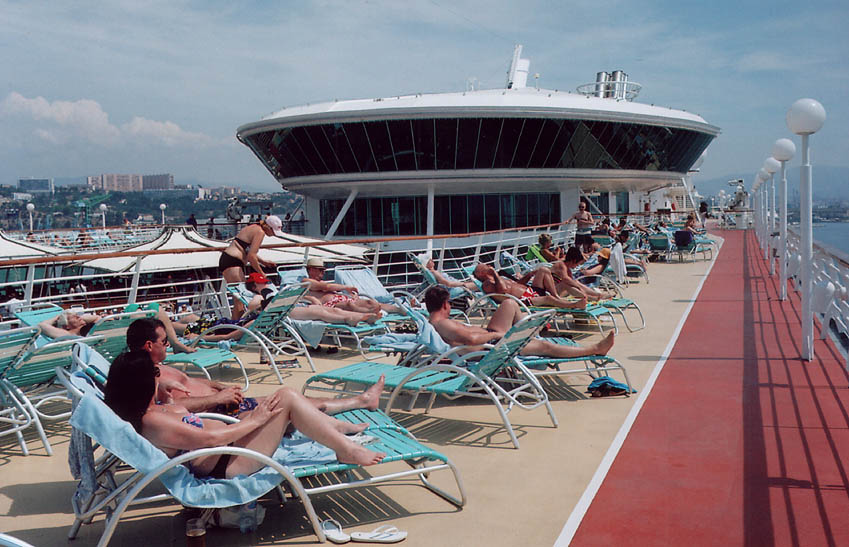 Cruise 01: Getting SUNBURNT on the pool deck of 'Grandeur of the Seas' !! Not MY Idea of a good time ! 35mm f1.4 Canadian Summilux 1966 on a 1986 M6, outdated Fuji Reala 100 rated at 80 ASA 1/500th at f5.6