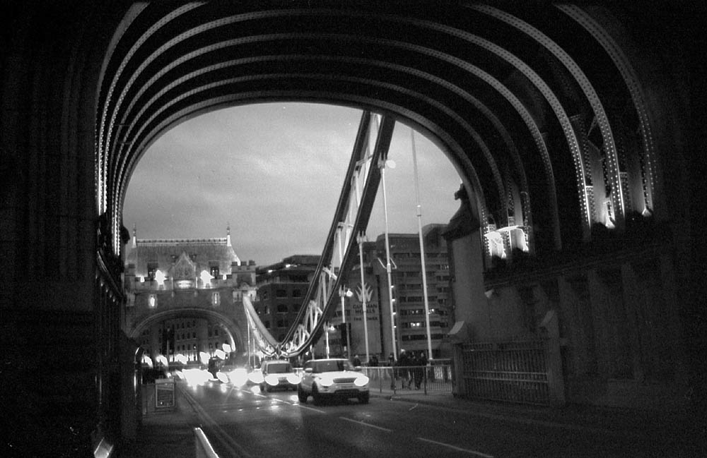 Under Tower Bridge London at night :1986 M6 + 1966 Canadian Leitz 35mm f1.4 Summilux, outdated Agfa 'Scala 200' rated 100 ASA processed in ID11 1+1 for 12 mins Aperture f1.4