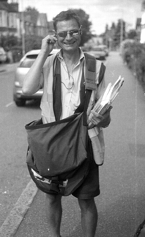 Leica 1934 : our Postman on outdated Ilford FP4 film, home-processed in Acutol-S Formual 1+1 -- dull light, 1/100 at f4.5