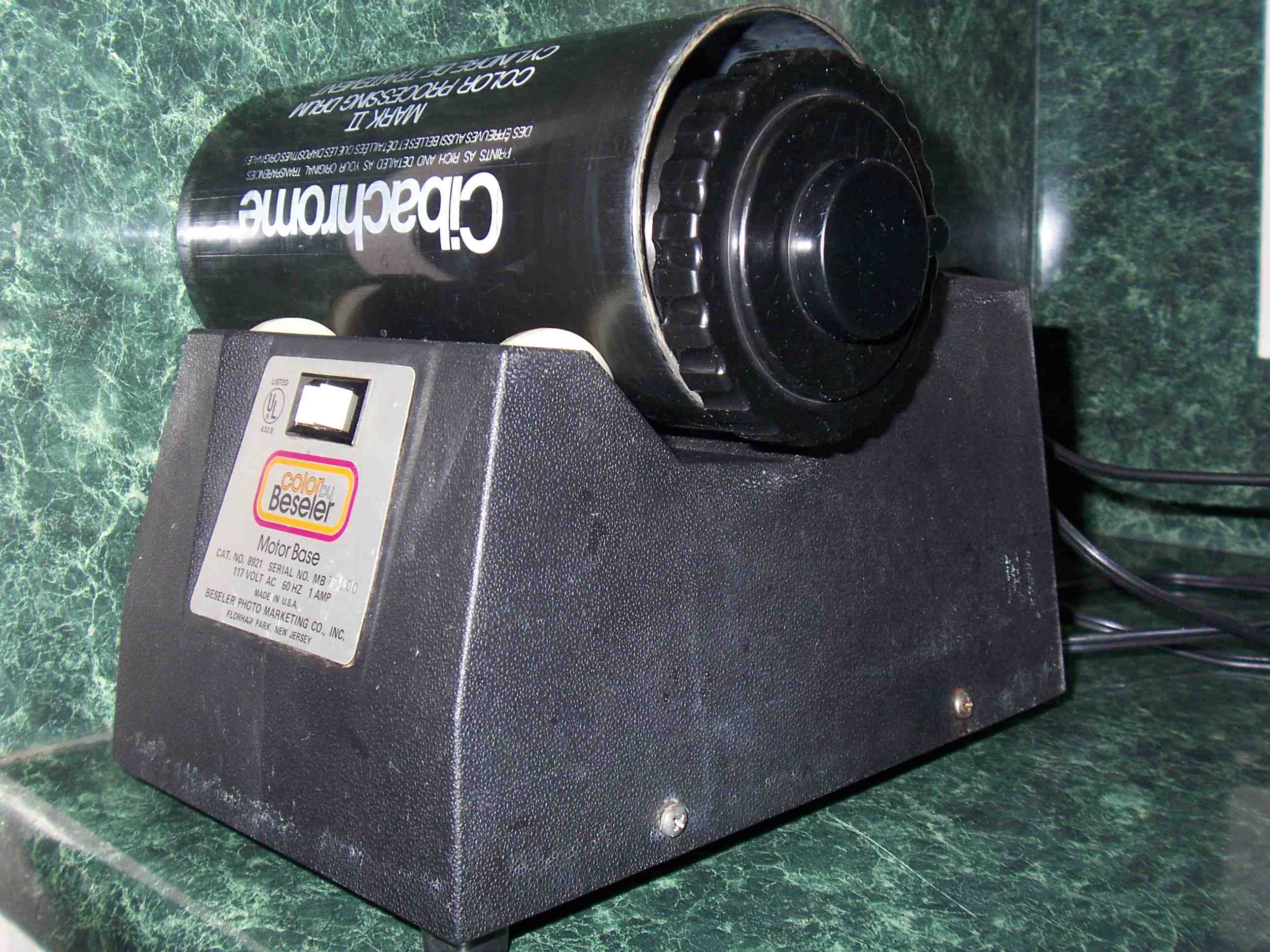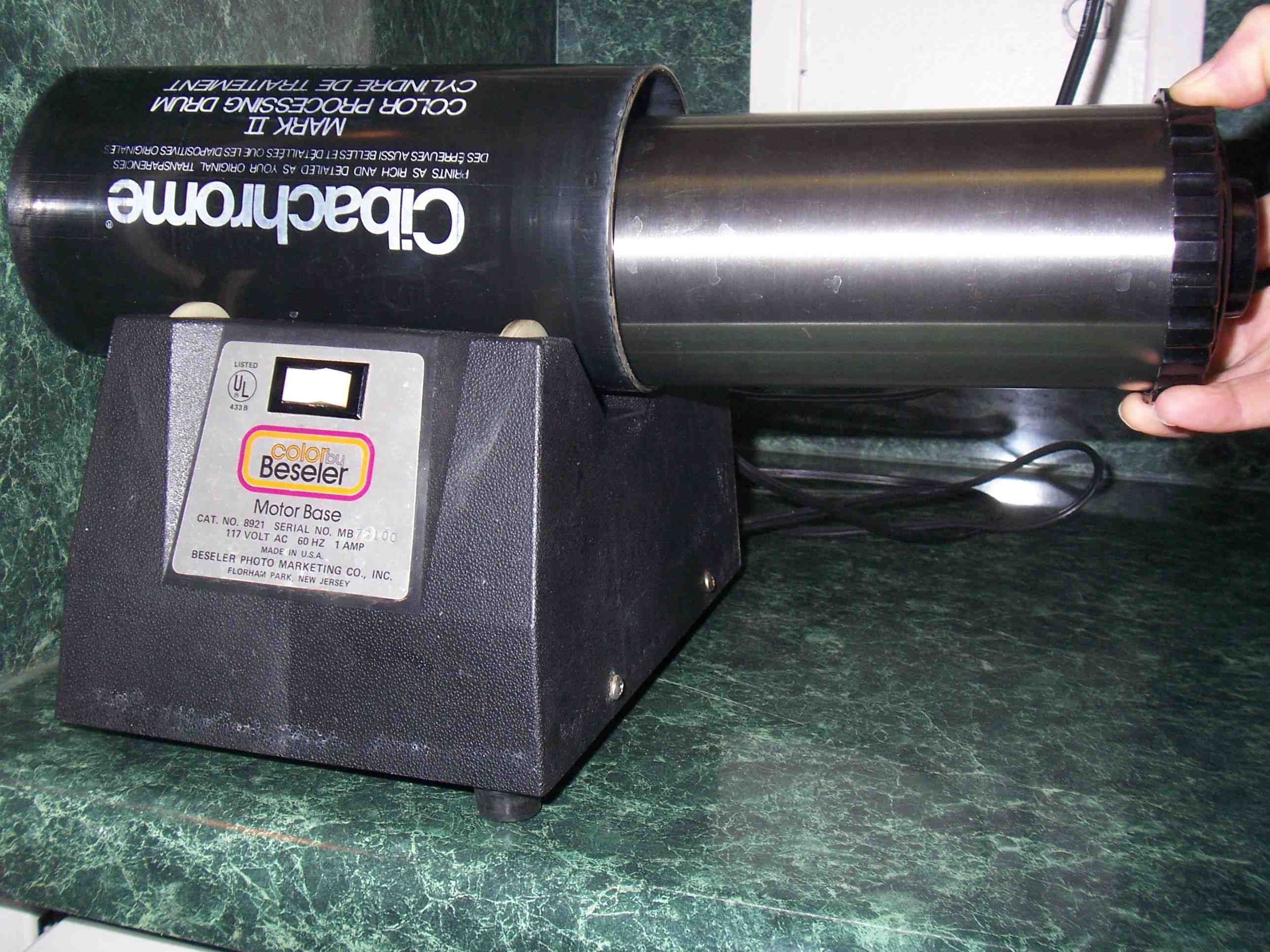 I've started roller processing my roll film in the stainless steel tanks. It takes 1/2 the chemistry since I only need to fill up the tanks 1/2 way. It's worked PERFECTLY since the first time. What I do I use a PLASTIC cap tank and put it in a disused cibachrome drum (smooth inside) and on the roller base. I fill it up half way and use the SAME dev times! I was amazed that the experiment worked. I've been doing this for a month now with no problems. Stainless caps you don't want to even try--not only because of the leaking problems but also because the plastic cap provides a ridge to keep the tank from rolling in the cibachrome drum. Most drums will pull in or push out, so you have to put the tank on one side or the other so when it rolls, you it "sucks in" the tank and it rides on the plastic cap ridge against the edge of the cibachrome drum. See pic. I now use 16 oz to develop 2-120 rolls in the 32 oz tank. AND my hands are now free!