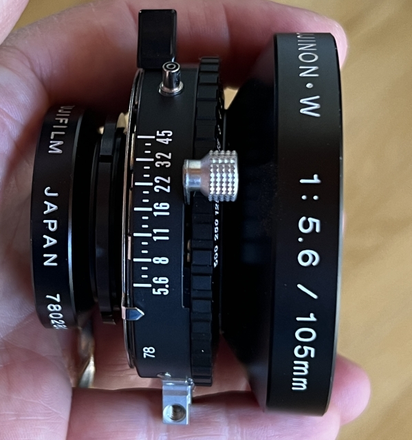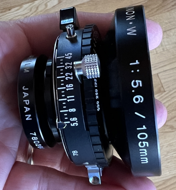 The CM-W line is the last iteration of the Fujinon plasmats. All the shorter ones, including this 105mm, take 67mm filters. This one looks essentially new - I've found no obvious marks or signs of use. Fuji's specified coverage for the 105mm at f/22 is 78 degrees, giving an image circle of 174mm. The shutter operates correctly and all speeds sound accurate. It weighs 235 grams on my kitchen scale with the included original caps and retaining ring.
