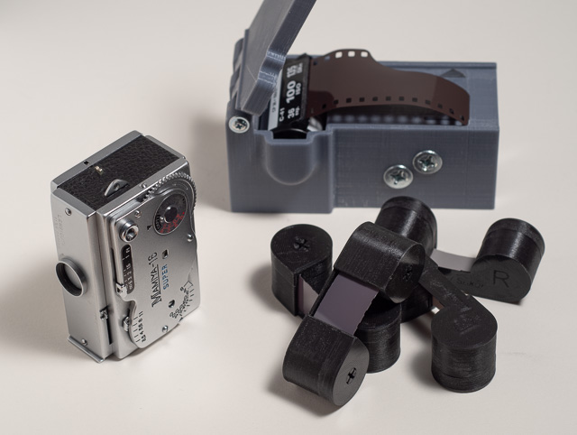 I 3D-printed a film slitter, and am currently in the process of printing film cassettes. I needed to slightly modify the latter as the designer had assumed single-spindle only, but the Super has a spindle on the supply side of the cassette too: It simply twirls a visual indicator which lets you know that film is advancing properly. The feature was removed from newer Mamiya-16 cameras for good reason: It makes loading the cassette into the camera a lot trickier! It took me awhile but I think I figured out a simple technique which lets me drop the cassette into place without undue frustration or film-wastage: Start with the supply spindle first, lining up the mating parts hand if necessary, and once that drops into place deal with the take-up spindle, which is lots easier. But it's no wonder that Mamiya went through a number of iterations of their film cassettes!