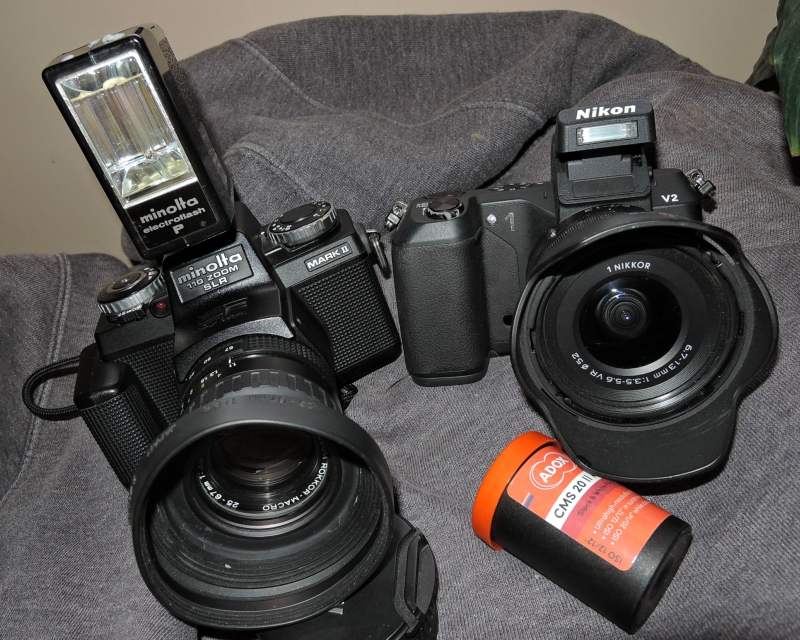 Pictured via 8x6mm sensor: the previously featured Minolta Mk II and its mirrorless doppelganger, the Nikon V2. The format and ergonomics are strikingly similar but they're very different cameras under the hood.
