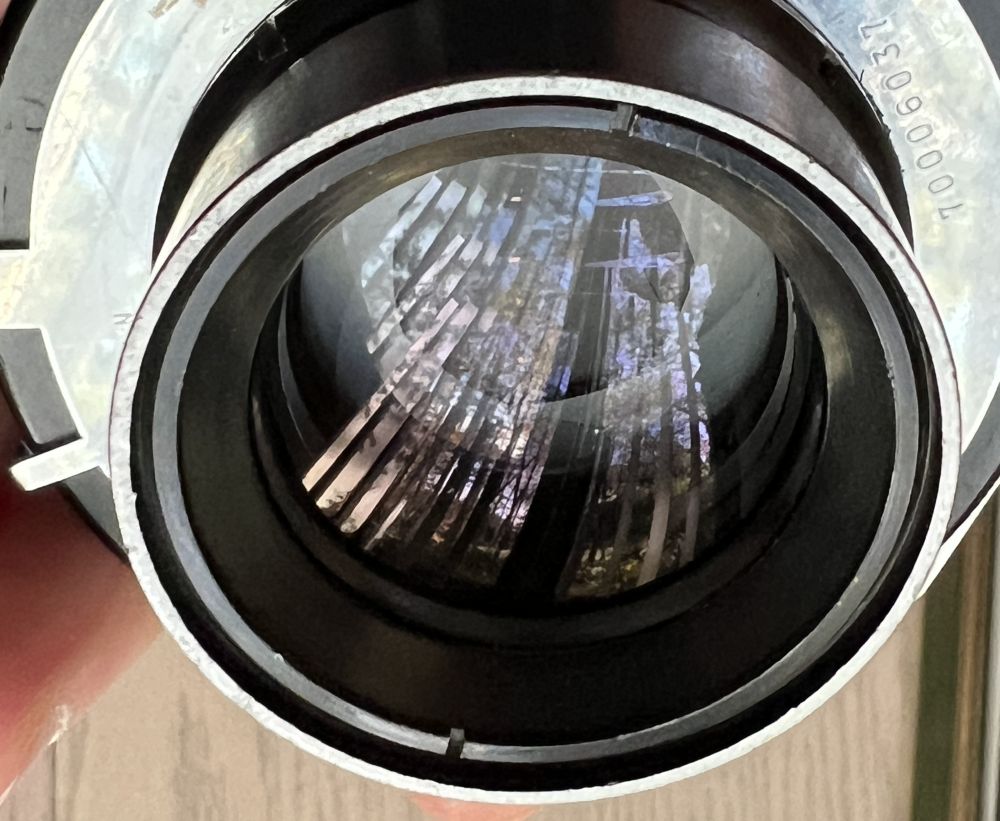 This example is not perfect but it's perfectly usable. There are a couple of small nicks on the front surface, beyond that the cells are clean and clear. The shutter sounds slow but repeatable at 1 sec and 1/2 sec; it's usable as-is but you should pursue a CLA if you're going to give the lens heavy use. It comes with the retaining ring but no caps.