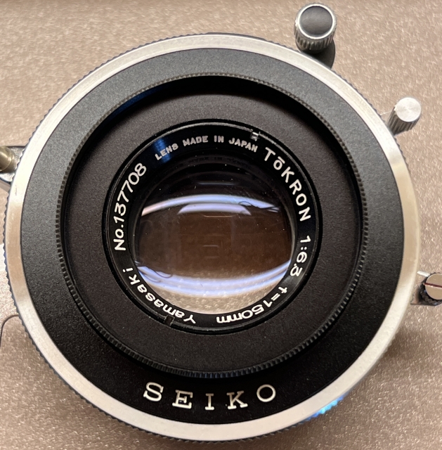 Here's one I've never seen or heard of before. The trim ring calls it a Tokron (long "o") and it's marked as being made by Yamasaki. Since it came on a Toko (also long "o") FL-452 4x5 I bought last year I believe it's likely a custom naming done for Toko. Given its size and maximum aperture it's probably a Tessar so will cover 4x5 with a bit of movement. The glass is clean and clear but there's a small amount of coating damage on the inner surface of the rear cell from someone's overly aggressive cleaning. The shutter operates smoothly, the speeds sound appropriate, and the retaining ring is included. It mounts in a Copal 0 hole. The filter size appears to be 40.5mm. There are no caps but the 42mm and 31.5mm front and rear caps from my 100mm Symmar-S fit perfectly. This is quite a lightweight lens at 138 grams (4-7/8 US ounces) with the retaining ring, just 2 grams more than the 150mm f/6.3 Fujinon-W in Seiko 0 and 10 grams less than the 150mm f/5.6 Xenar in Copal 0.