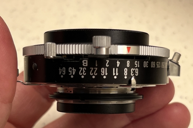 The Seiko shutter's operation differs from a Copal in that it must be cocked to open it for focusing. Cocking is via the lever with the black-centered knob, and opening/closing is done with the nearby lever with the slightly smaller all-silver knob (this one is almost diametrically opposite the release lever).