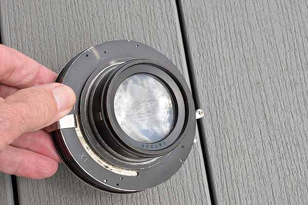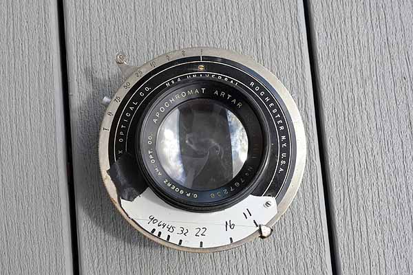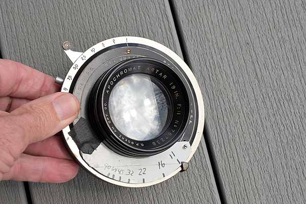 19" Artar F/11 in #4 Universal shutter. There is no board or mounting ring. The shutter works but at a minimum before using it I would have the speeds measured. It has a home made F/stop scale. Buy this for the glass. Extremely sharp lens