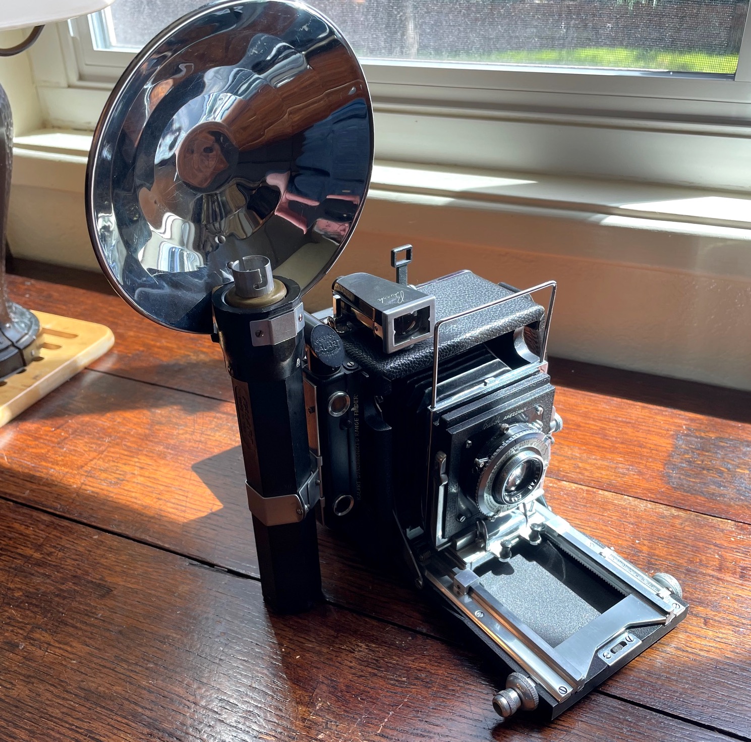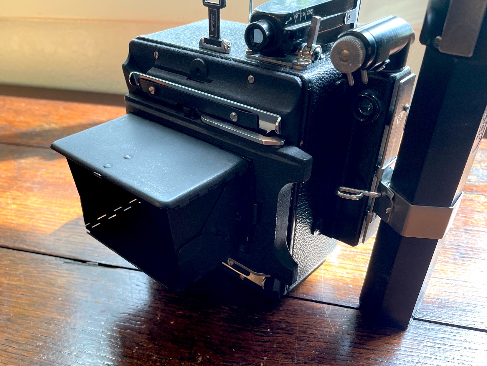 The camera back has been retrofitted with a 2 1/4 x 3 1/4 Graflok back.