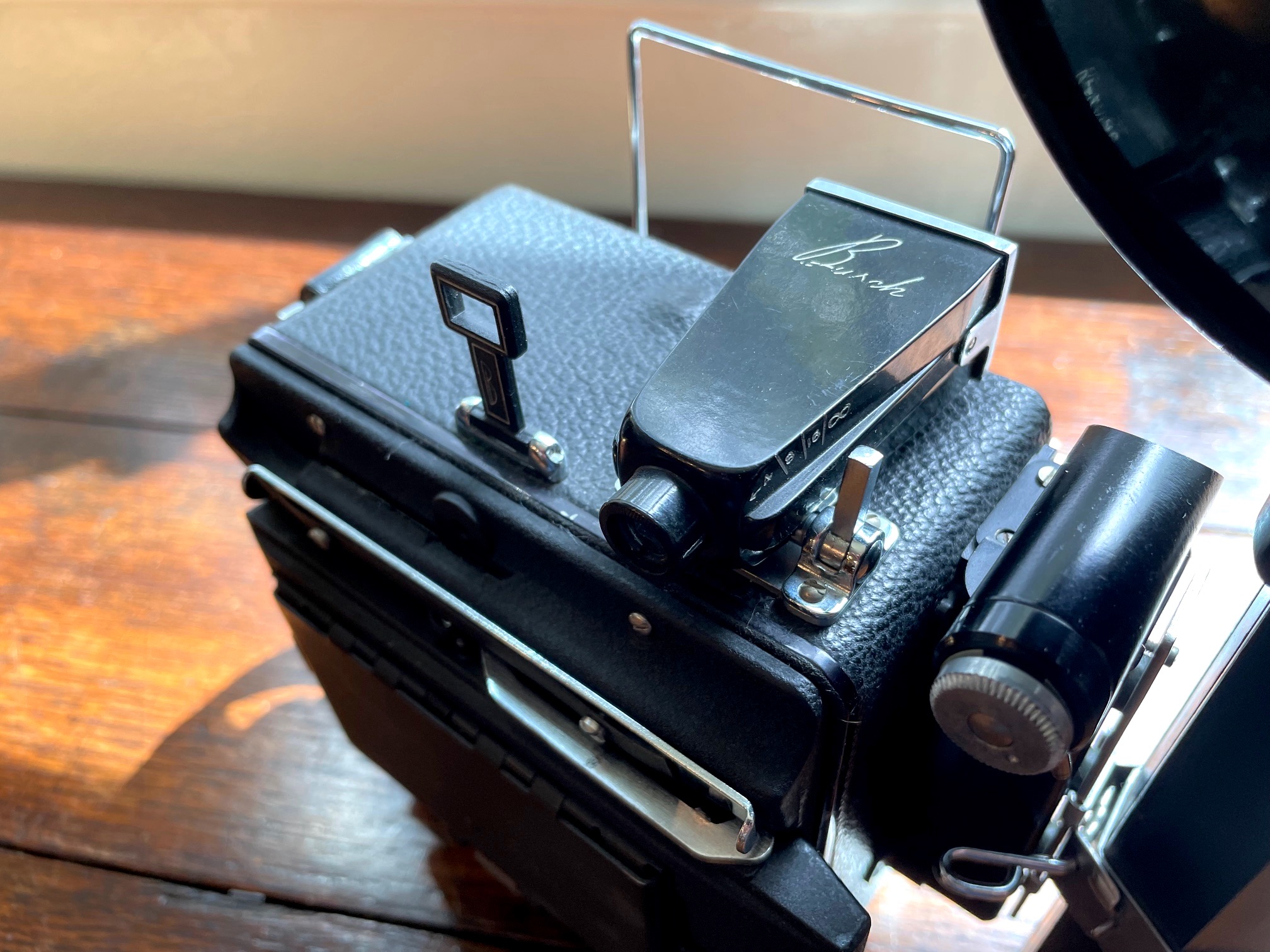 The camera back has been retrofitted with a 2 1/4 x 3 1/4 Graflok back.