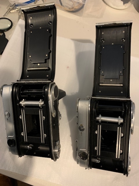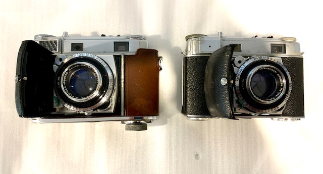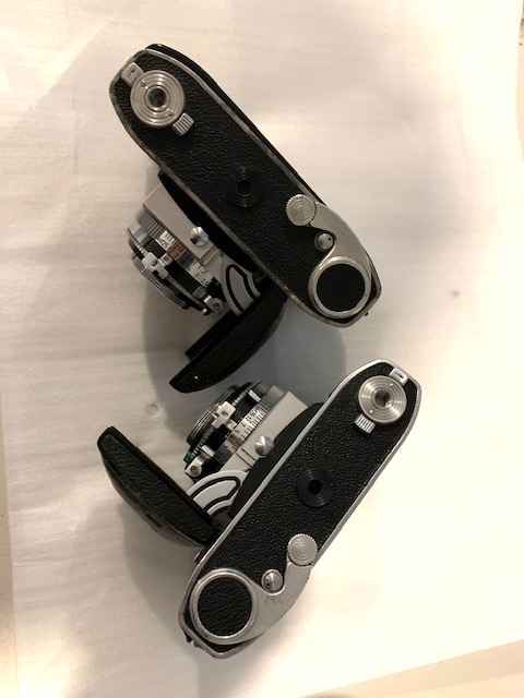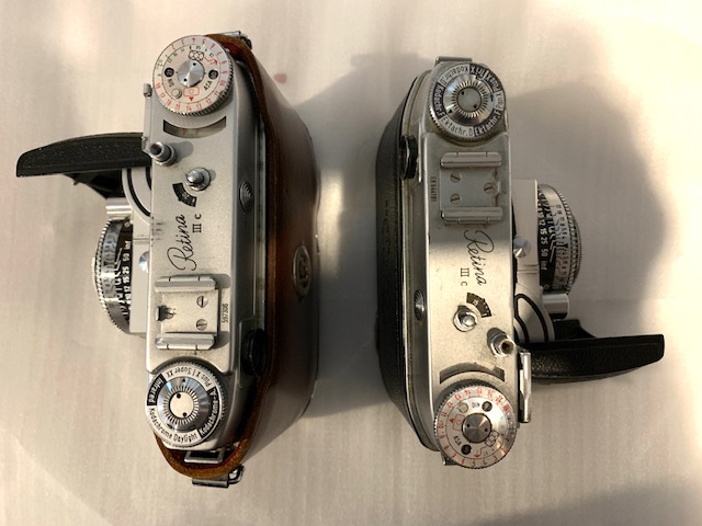 Early spring cleaning and found these 2 Retina IIIc cameras. Both in good shape cosmetically but need a good clean and glass looks good - both have the Xenon F2 lens. The one with the half case I used about 2 years ago and it worked fine. Shutter still fires on all speeds and rangefinder works and exposure meter registers but does not seem to be accurate. On second body shutter fires erratically and needs attention. Fix or good for parts.