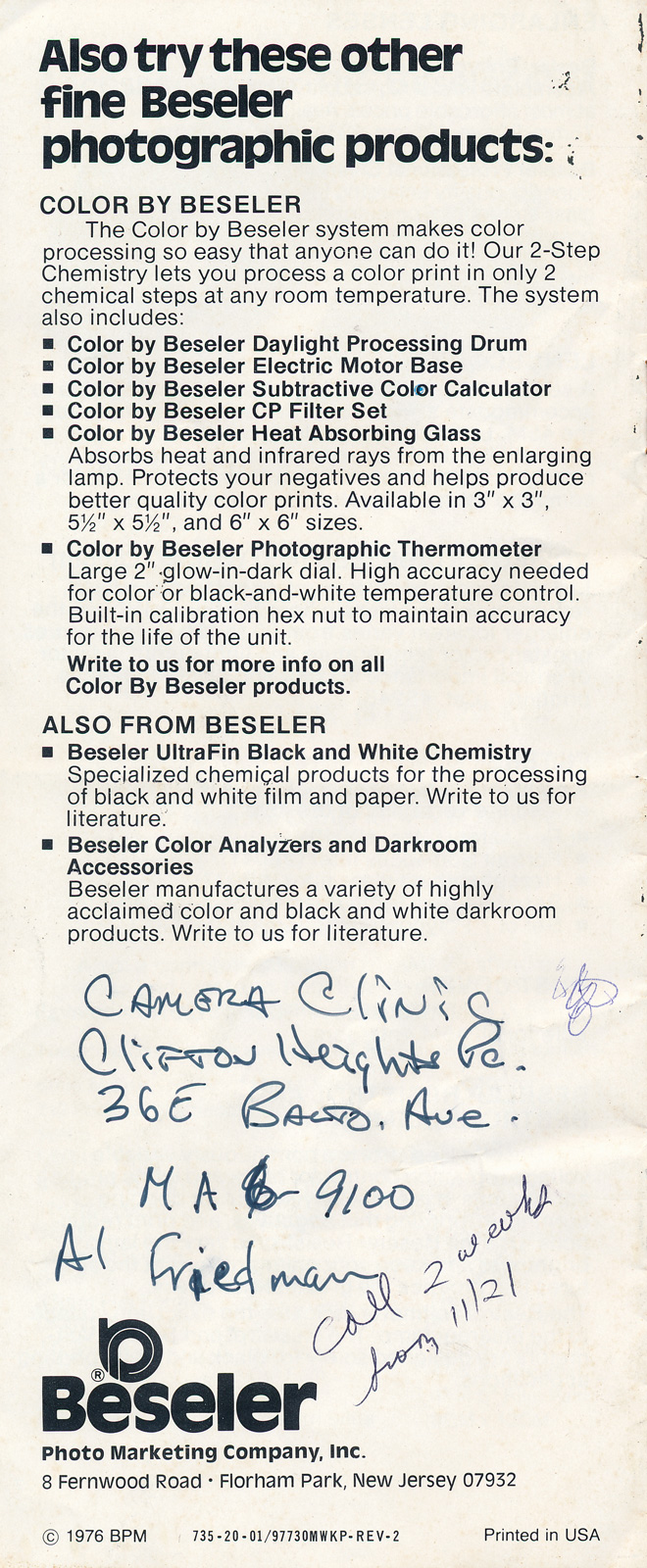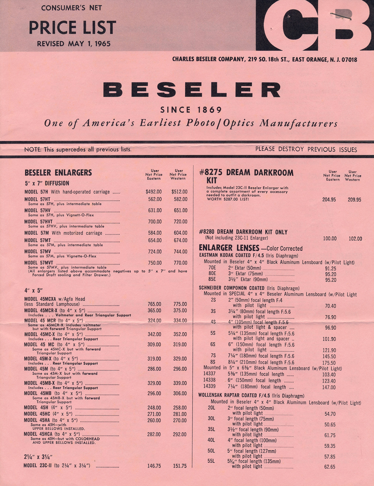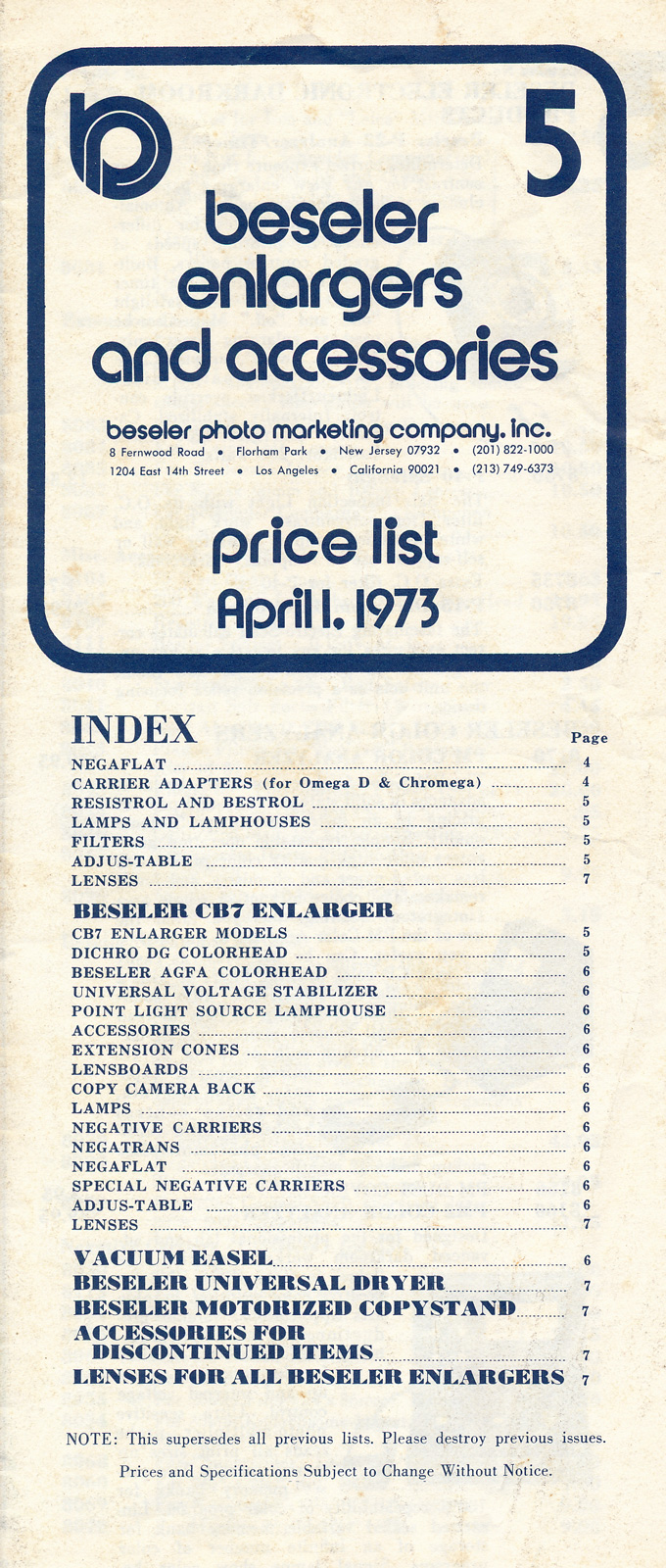 1) Beseler enlargers and accessories, price list, April1, 1973. Three of the items are circled in pen.
