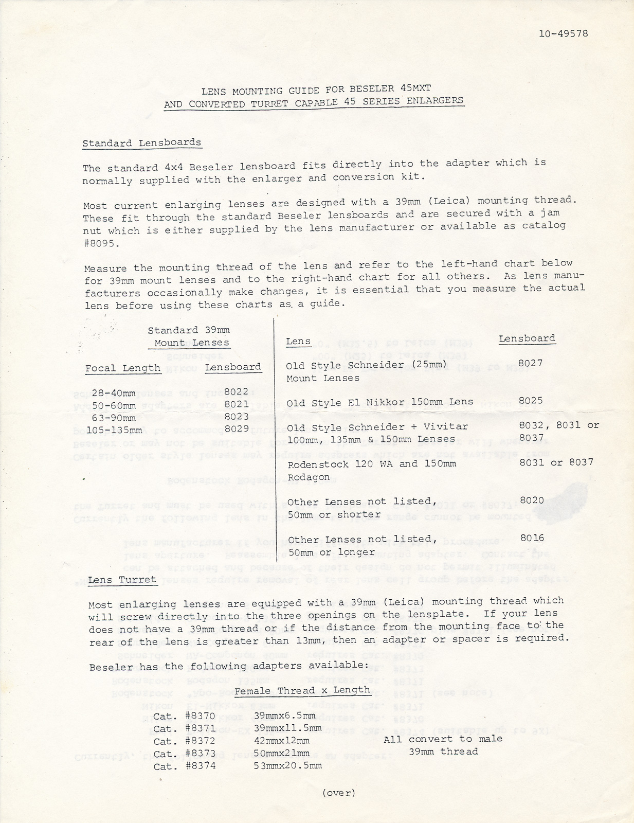 18) Lens mounting guide for Beseler 45MXT and converted turret capable 45 series enlargers, 1978.