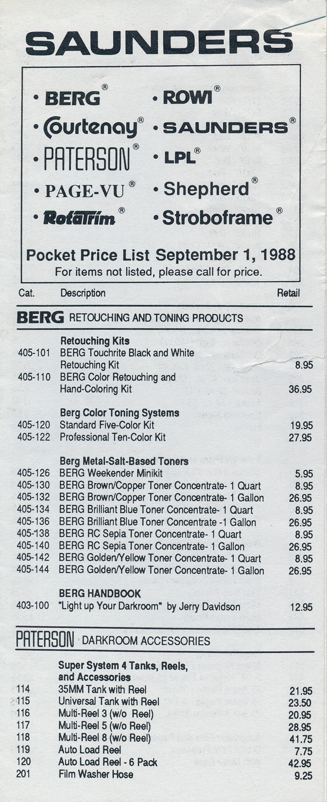 5) Saunders pocket price list, September 1, 1988. Tears on the front flap.