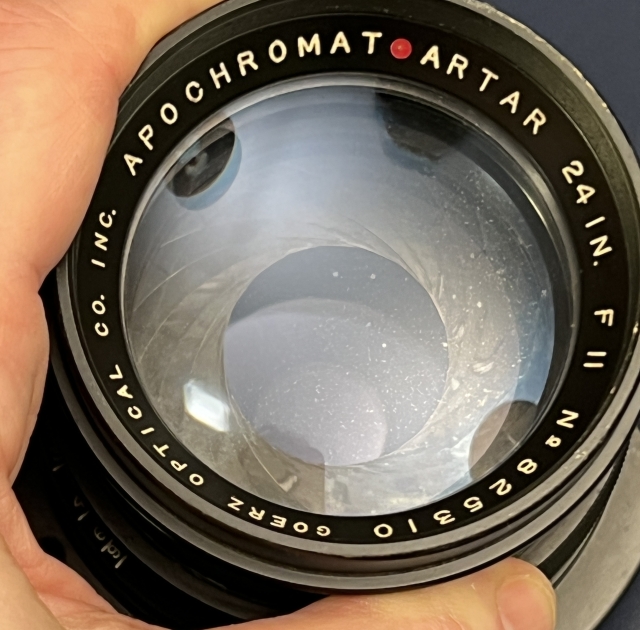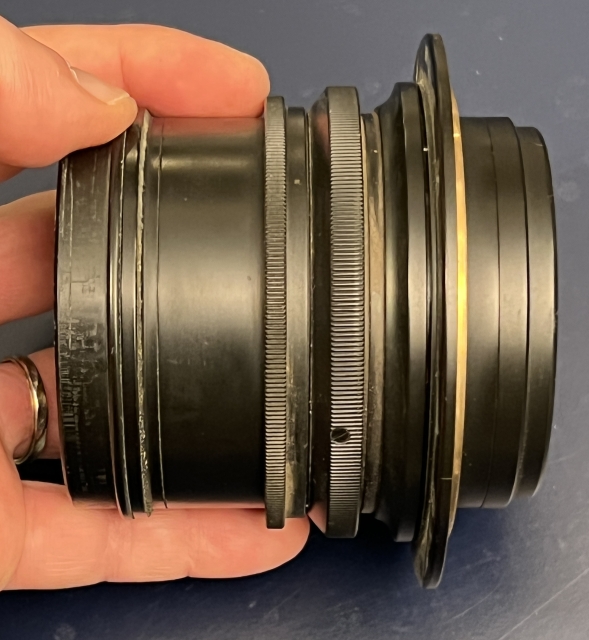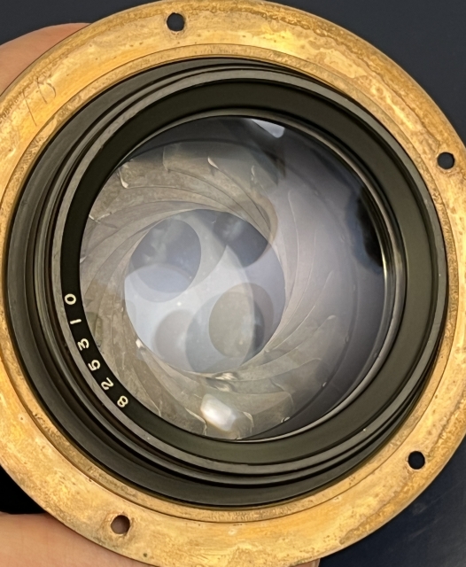 This lens is not for the faint of heart or weak of front standard as it weights a shade over 2-1/2 pounds in its (apparently) brass barrel. As with many lenses removed from graphic arts cameras, it's not perfect and shows signs of age and use. There is some spotting on the front coating that hasn't responded to my gentle attempts using Rosco tissue and Panchro fluid. Other than that, the glass is very good with no apparent scratches and minimal dust. It comes with the mounting flange but no caps. Thanks to a judicious choice of lighting the front coating spotting looks worse in the photo than in real life.