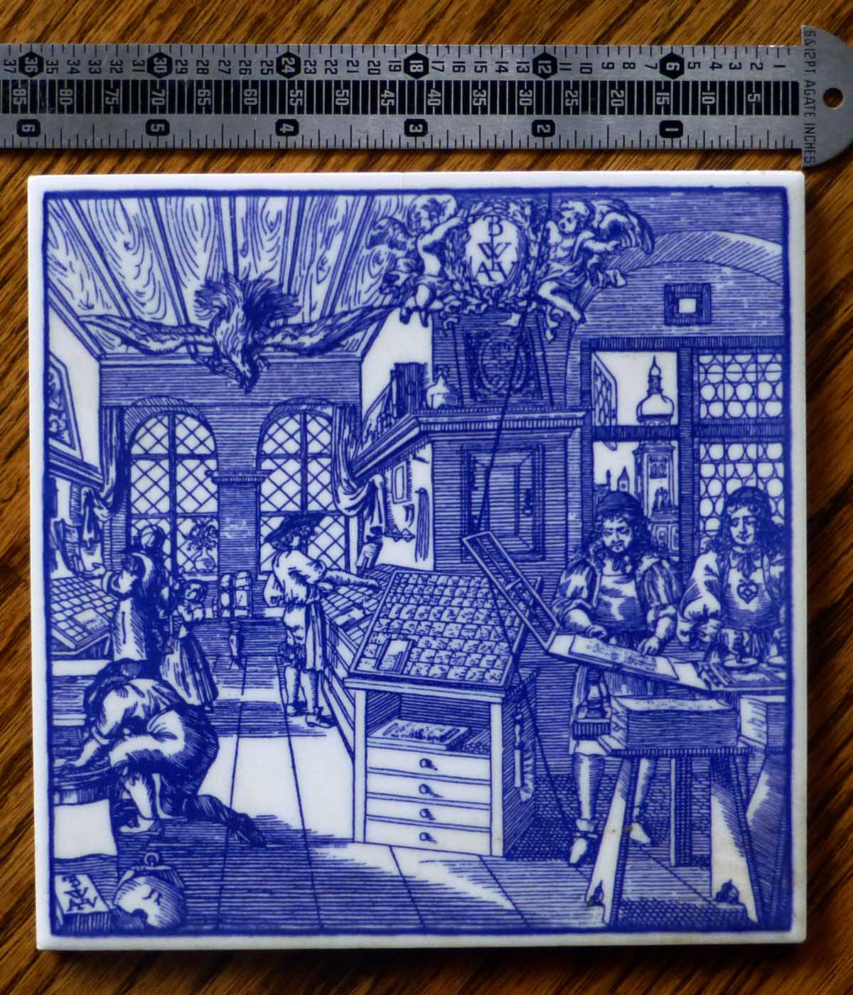 17th and 18th century typesetters and pressman drawing on blue glazed ceramic tile