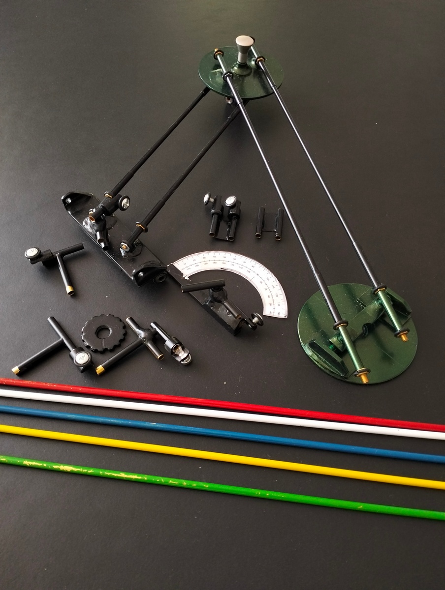 The left part of the 3-D model is a supporting rod mechanism that functions according to the principle of an old-fashioned drawing machine (US patent from 1901). This makes it possible to move the yellow Film Plane accurately and without rotation in both the vertical and horizontal directions. The movement of the yellow film plane, which is actually the focusing on the subject, is towards or away from the green parallel-to-film Lens Plane. At the same time, the Scheimpflug Line moves over both the white Lens Plane and the red Plane of Sharp Focus. This left part of the 3-D model is, as it were, the motor that drives the mechanical rod mechanism and rotates the Plane of Sharp Focus around the Hinge Line.