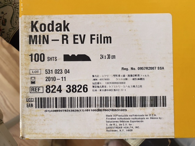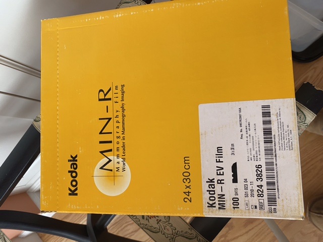 This is a great opportunity for large format photographers to experiment. Three full unopened boxes of Kodak mammography film. Located in the northeastern US state of Massachusetts. Size is just under 9” x 12”.