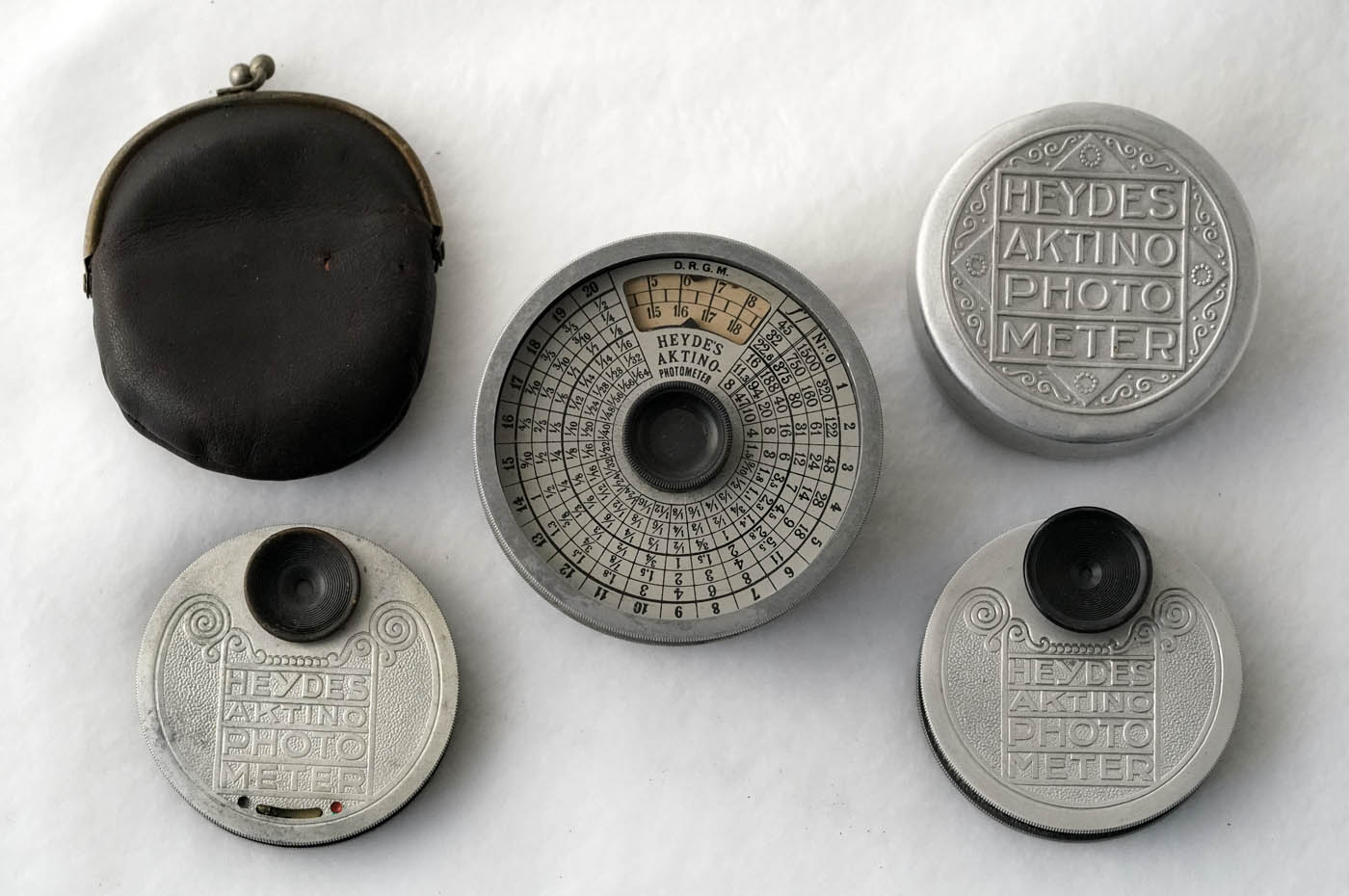 Three vintage Heydes Aktino Photo Meters one with a metal case, one with a leather pouch and one without a case. Made in Germany, one says Herbert & Huesgen Co., New York Sole Agents - U.S.A. All 3 for one price. Nice addition to your photographica collection.