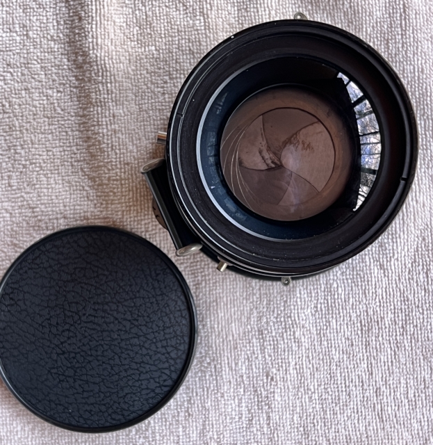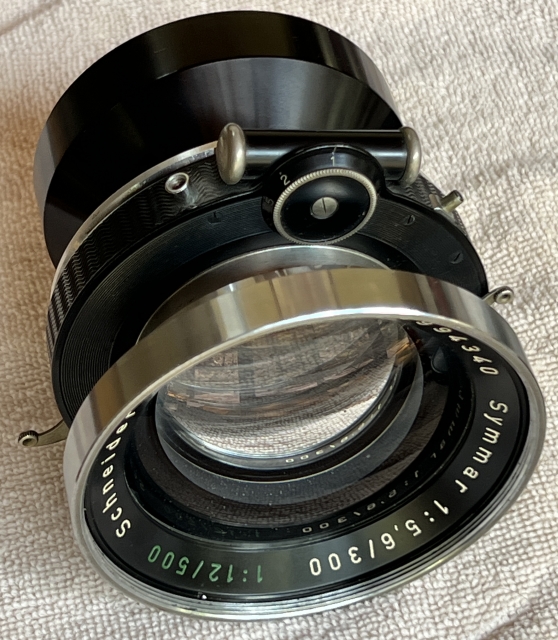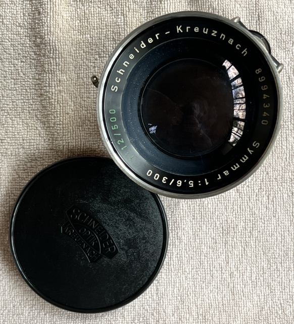 With both cells it's a 300mm f/5.6, remove the front cell to convert to a 500mm f/12. The lens is clean with good, not flawless, coatings. There's one very obvious tiny bright spec (bubble? dust flake?) inside the front cell, and surprisingly little Schneideritis. The front and rear cells are otherwise clean and clear, in very good shape given their age. There are no apparent dents or dings and both cells screw smoothly into the shutter. Includes the mounting flange, a Schneider front cap and a generic replacement rear cap.