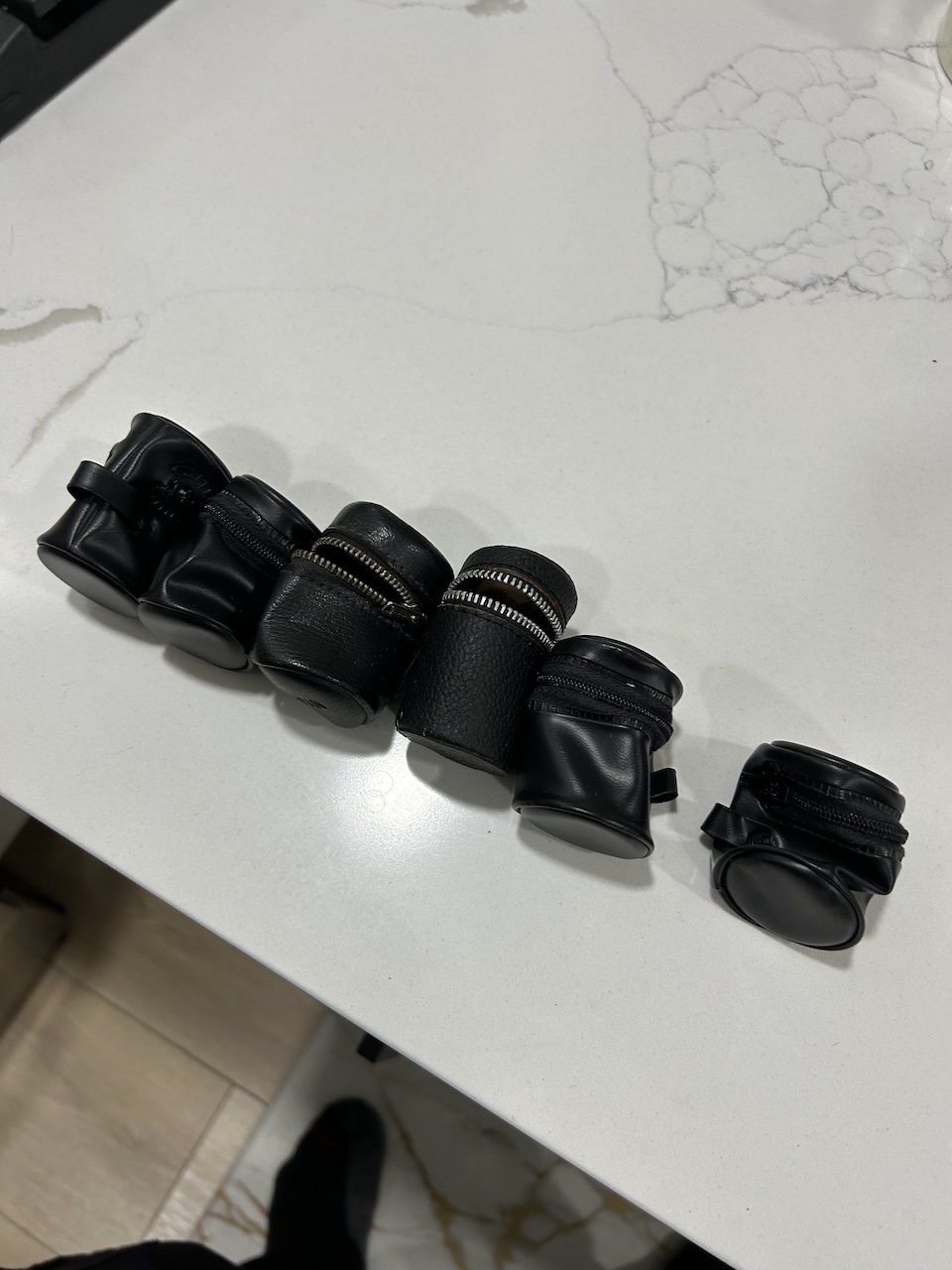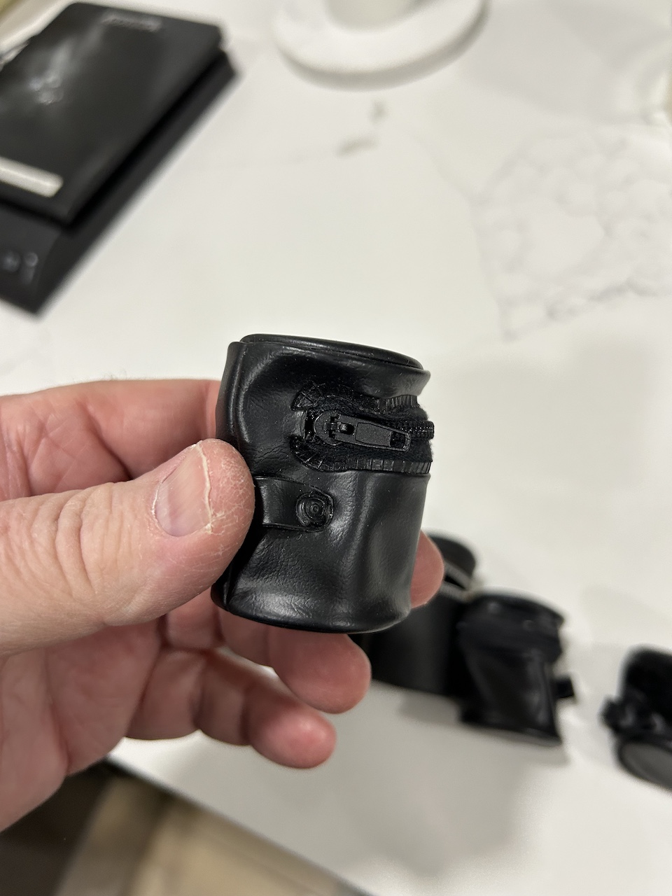 I am selling six 35mm film storage cases for use on camera straps. It looks like two of these (maybe three) are meant for full sized 35mm cartridges when housed in canisters, while I think the other four only take cartridges without canisters - so one has choices. It appears that two are made of real leather, while the others are of imitation leather. One case is marked Alpex, a popular Japanese aftermarket photo accessory brand from years ago, another is marked "Japan". These look a tad crumpled in the photos, but they fill out properly when film is loaded into them and their zippers are all in good shape.
