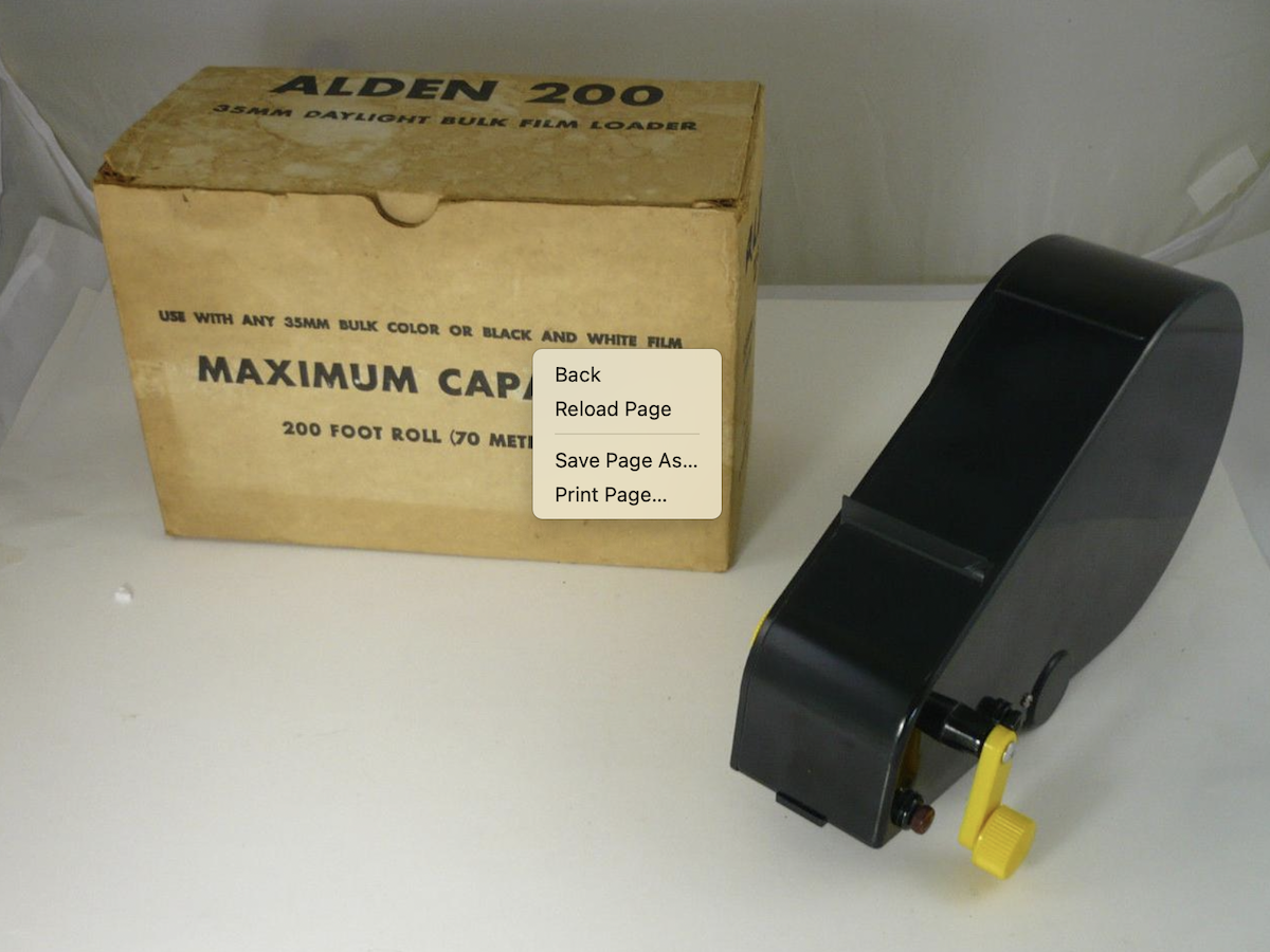 I've figured out that my "large" bulk loader is an "Alden 200" Model #72 bulk film loader. I measured the internal diameter of the film chamber -- around 6 1/2 inches or 16.5 centimeters. henryyjames in post #26 above says a 400 foot roll is around 6 inches in diameter, so perhaps this thing would hold a 400 roll. While I might hope it would take a 400 foot load on a very small diameter core, it is in fact designed to handle...200 feet of film. Unsurprising, given the name of the device! I've attached a photo found online -- the wording on the box confirms its intended capacity. I can't say that I recall ever seeing a 200 ft/70 meter bulk load for sale. Why make a device that apparently can take a 400 roll and sell it as holding 200 feet? Was film that much thicker 50 years ago?🙃
