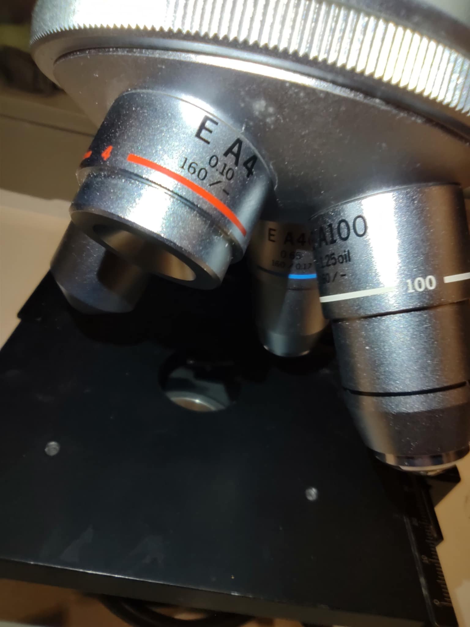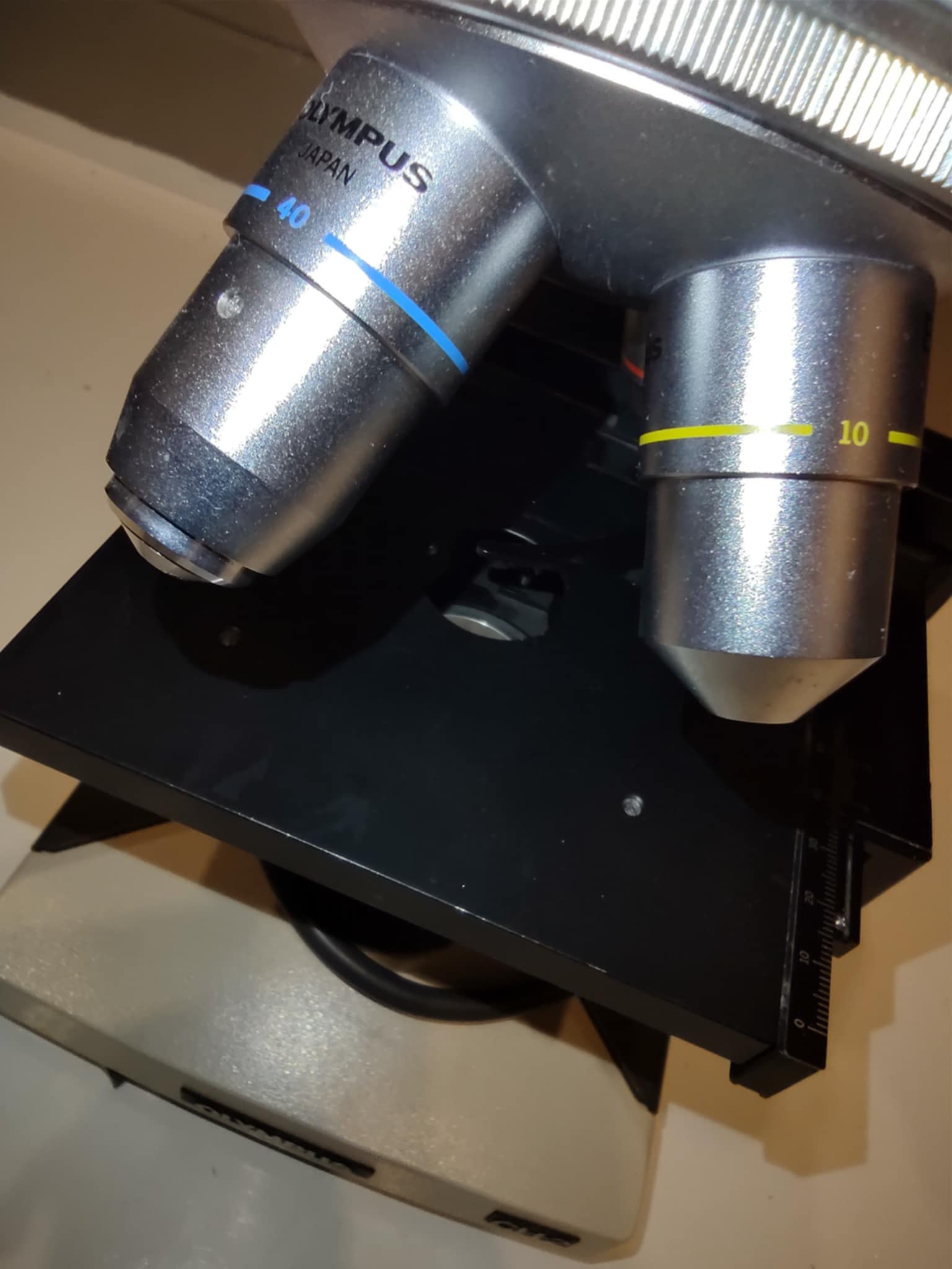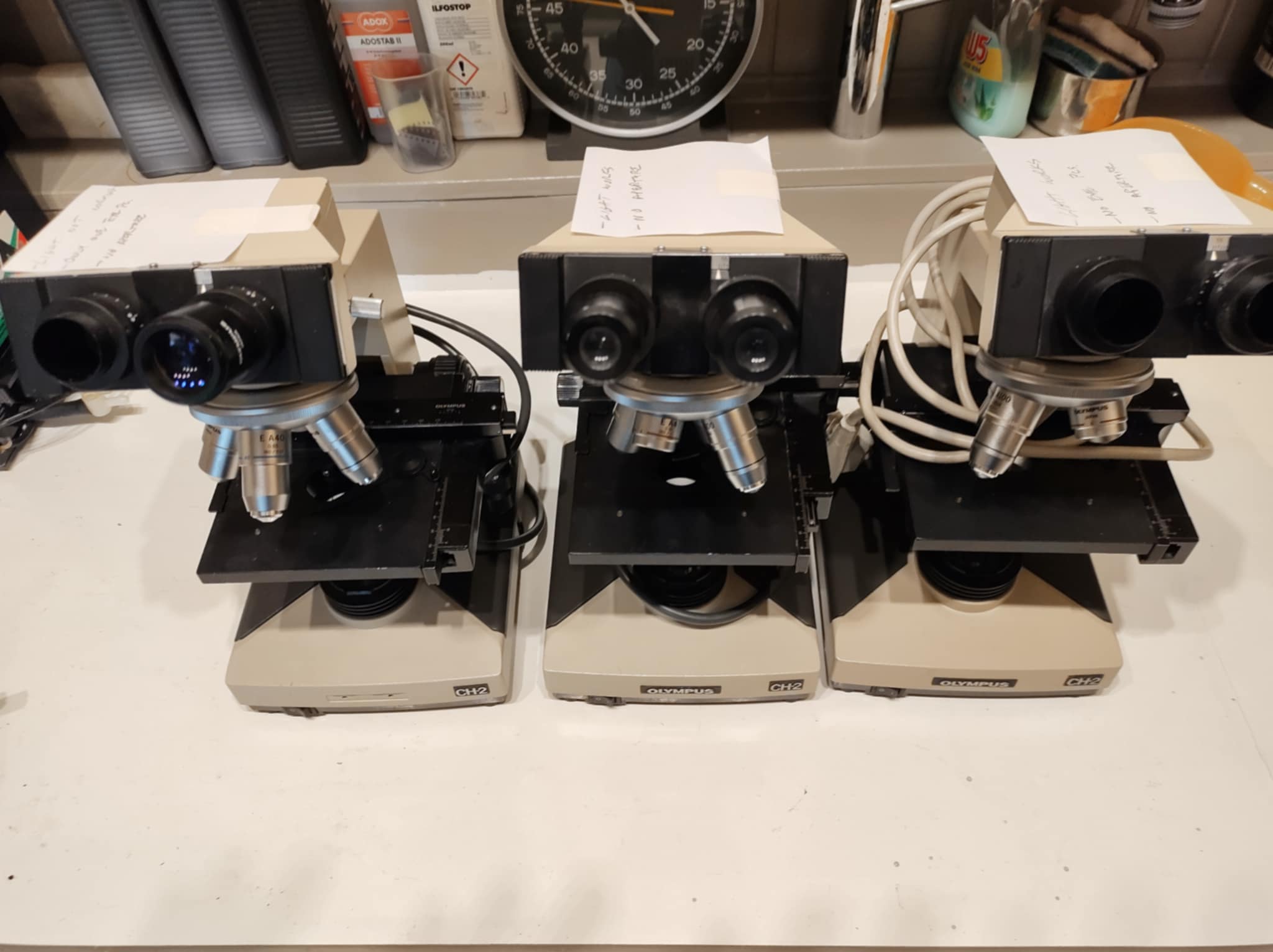 I have three Olympus CH-2 microscopes available. All will need a good cleaning. All movements are working and feel smooth. All three are 220V. I also have a spare specimen holder. Each has four magnification lenses. Please see images.