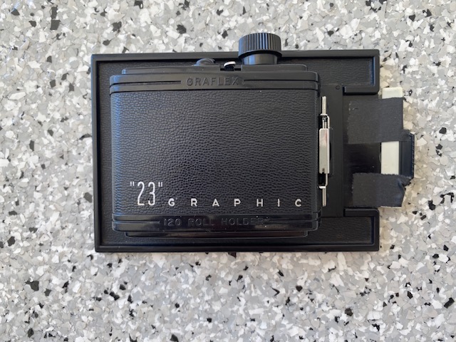4x5 to 6x7 120 Graphic roll film back. You can use it as it or get another slide. I used this successfully as is with the home made handle on the slide. $65/BO plus shipping.