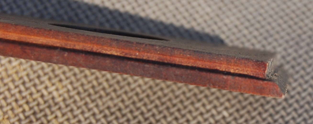 The hole is 1-3/4" diameter. The bottom edge (only) is cut at an angle (see second photo). There are 3 tiny screw holes where a flange was mounted on the front. They are not all the way through and are so small they really aren't noticeable, but they could be filled if desired. The back is flat black.