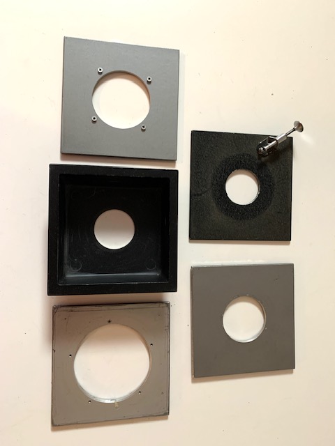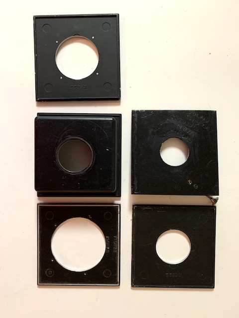 Cleaning out drawers and found these 5 lens boards for a Graphic View that I will never use. Hole sizes are 66, 51, 42, 35 (recessed for wide angle lens) and 33 mm.