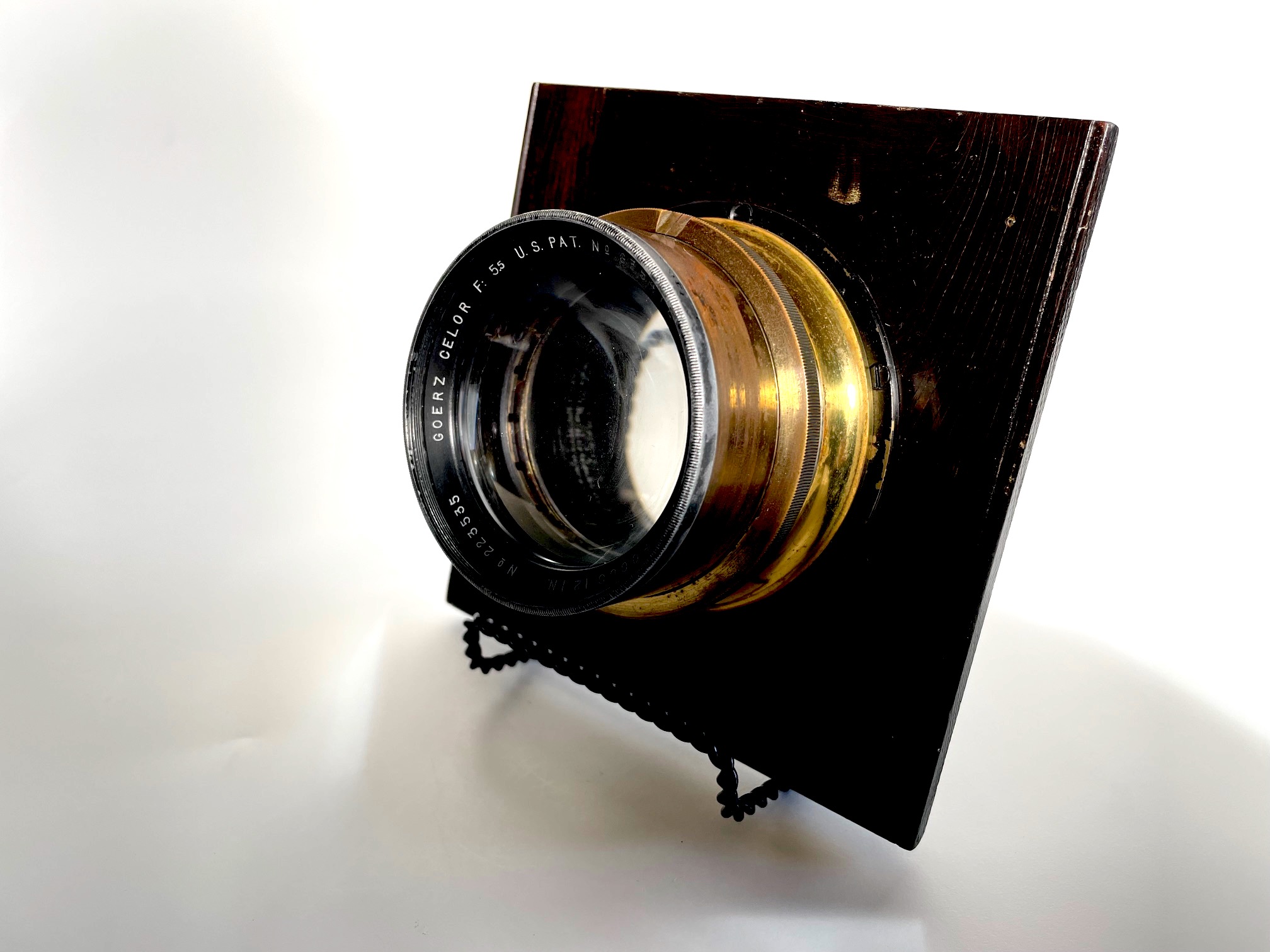 (2) extra lens boards, tube and squeeze ball for Packard Shutter and 12-inch f5.5 Goerz Celor lens with leather cap.