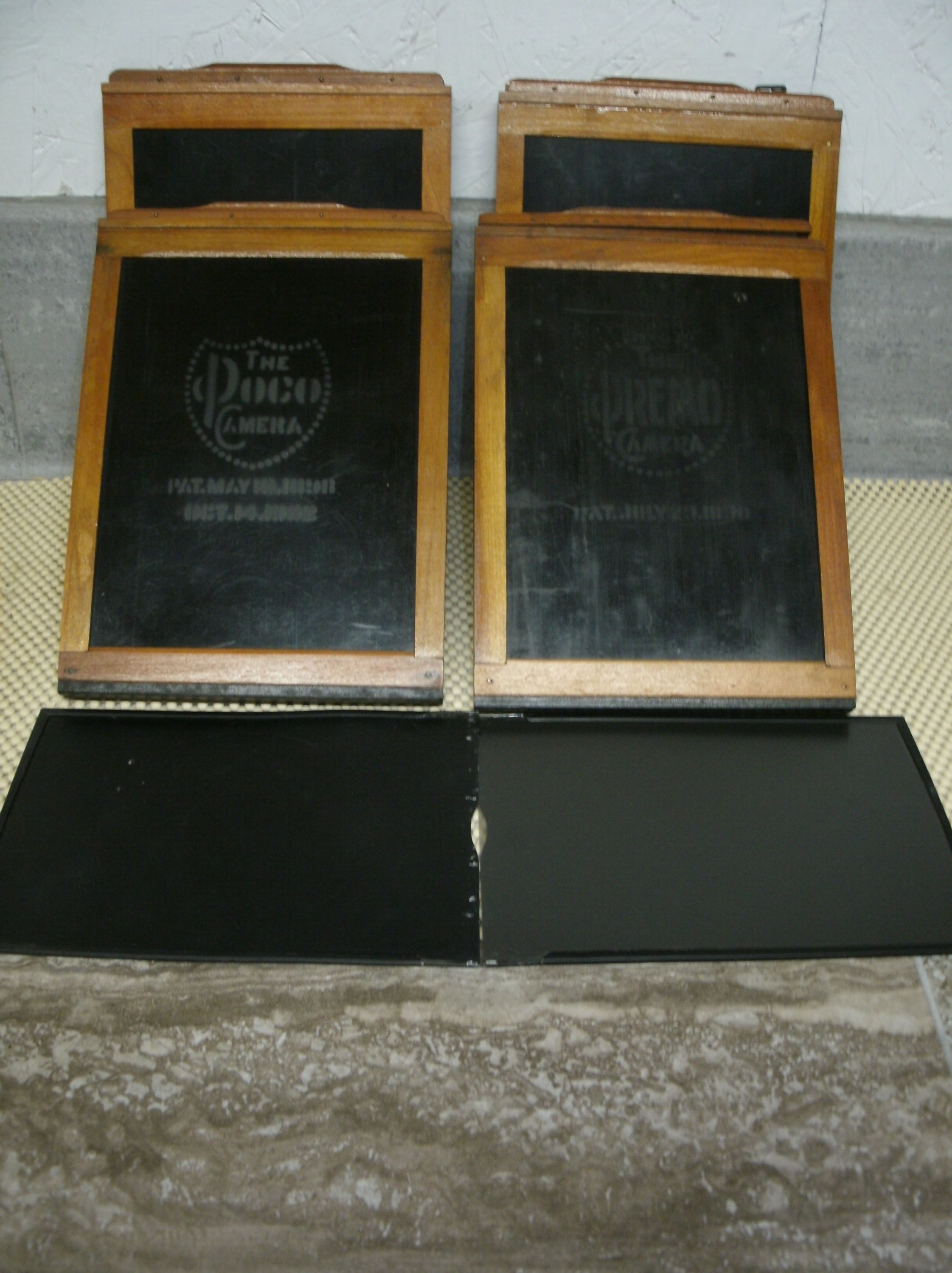 Set of four (4) Poco wooden dry plate holders. All are in very good condition and usable in modern cameras. One of the holders has a Premo dark slide, all other slides are Poco. Comes with two (2) 5x7 film sheaths. All hinges are in excellent condition.