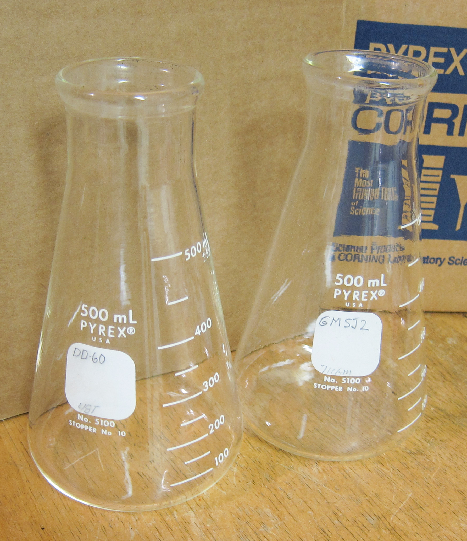 Sold 6 used Erlenmeyer 500ml Pyrex Flasks - $15 plus postage