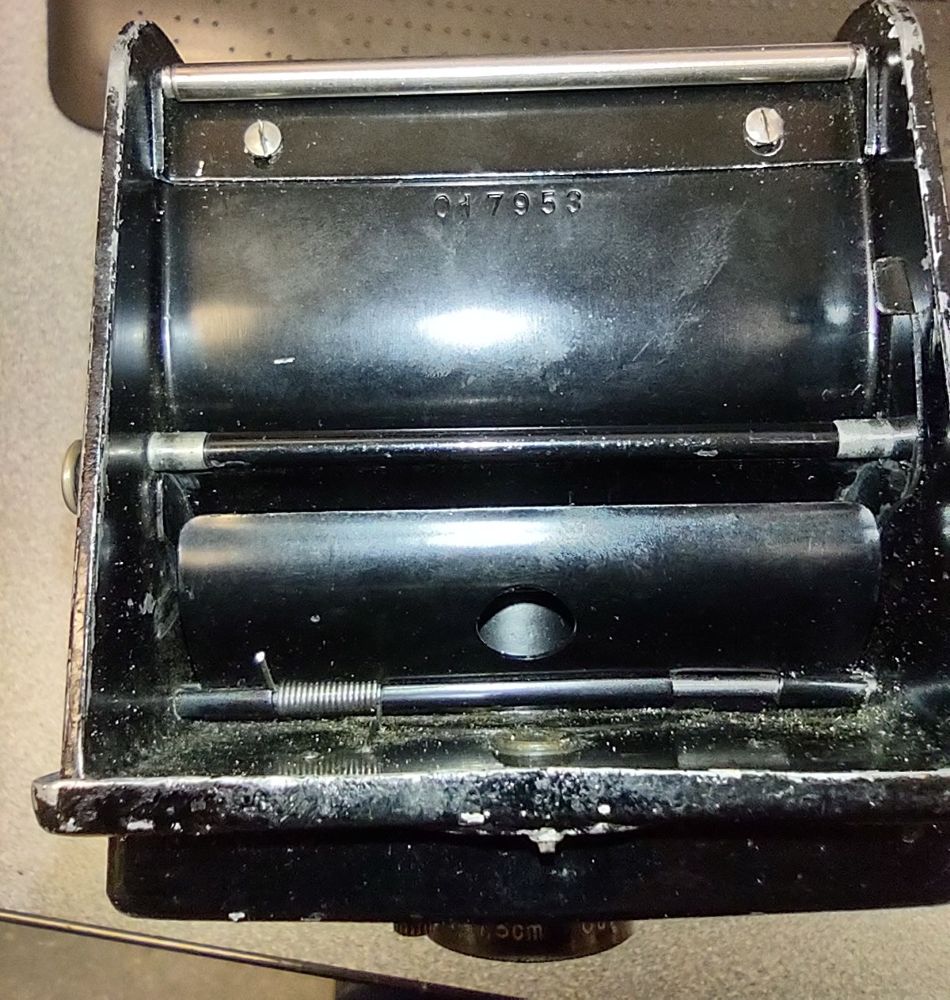 This might be a lost cause for me. I did find a cut down 120 spool inside, but it looks like I also had to sand the ends thinner to make it work, need to explore this more if I'm going to try and use this again. The lenses are fogged on the inside. The mirror is completely wrecked. Ground glass is dirty and dark. The finder is bent and slightly broken