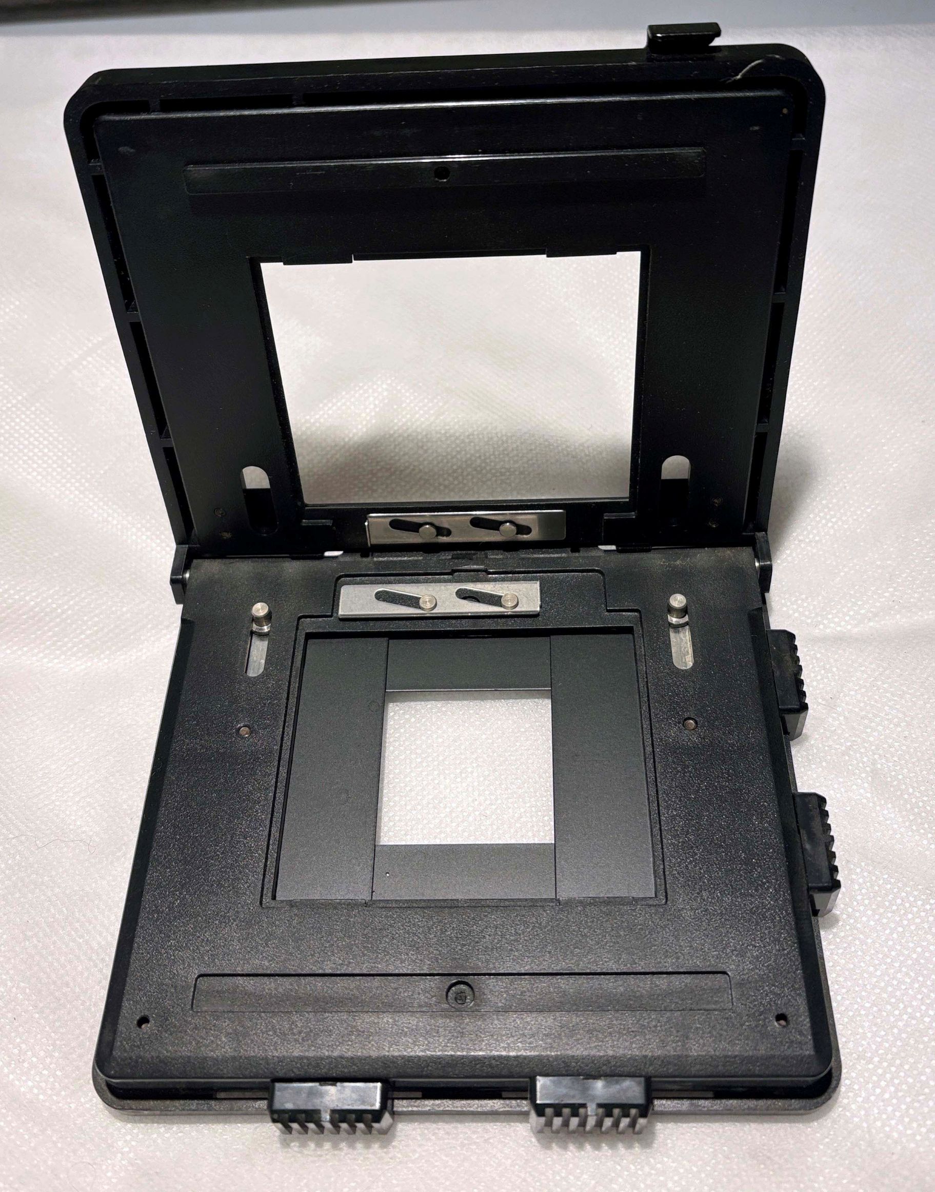 LPL 6x7 Universal Carrier with adjustable masking blades. This appears to be the same as the LPL 00100 but with the glass removed. I’m not sure it was offered this way originally. It works well with 2 ¼ film but I don’t think it will hold smaller format film flat enough. The masking blades can still be used for 6x4.5 and 6x6 formats. $90 plus shipping.