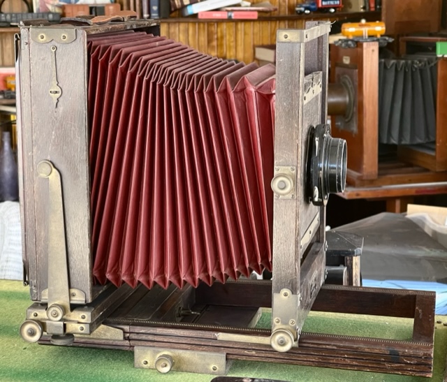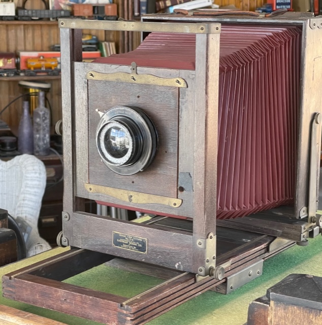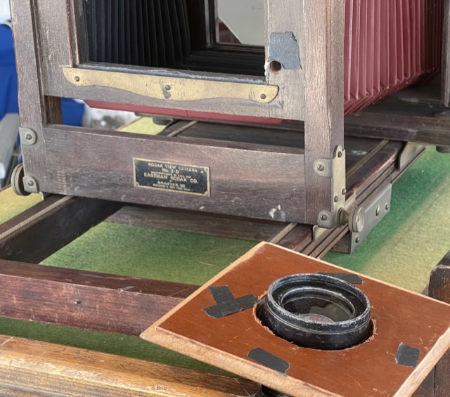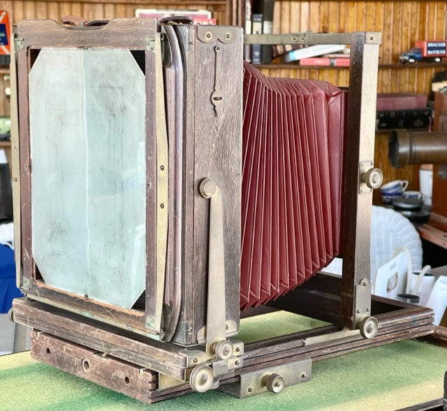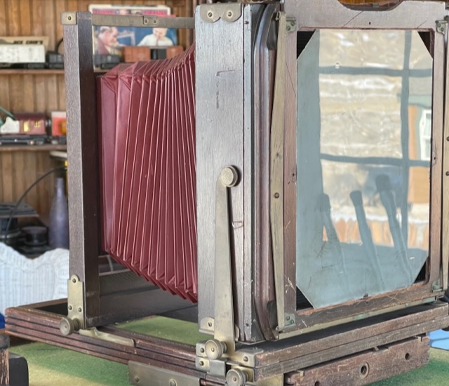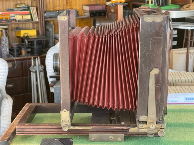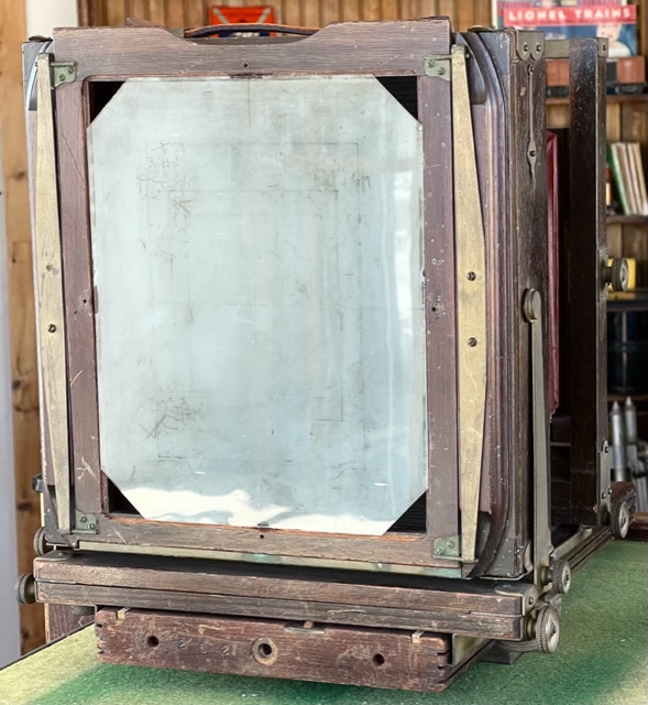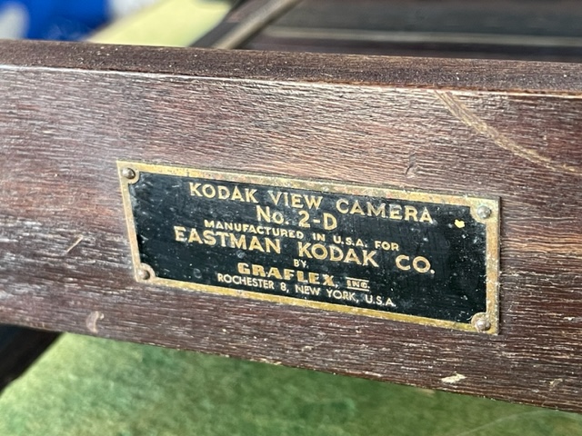 SOLD Offering a VERY serviceable Kodak 2D 8X10 camera. You can make awesome images the day it arrives. The bellows are excellent and the usually missing sliding tripod mount and 8X10 ground glass back are present. It has a couple of noted quirks. Hey it's almost 100 years old. The swing mechanism at the rear standard used to be gear driven. It just turns by hand now but the lock down for swing works great. All the other locks work well except the front standard. Everything's there but I didn't want to force it. It stays where it's put anyways.
