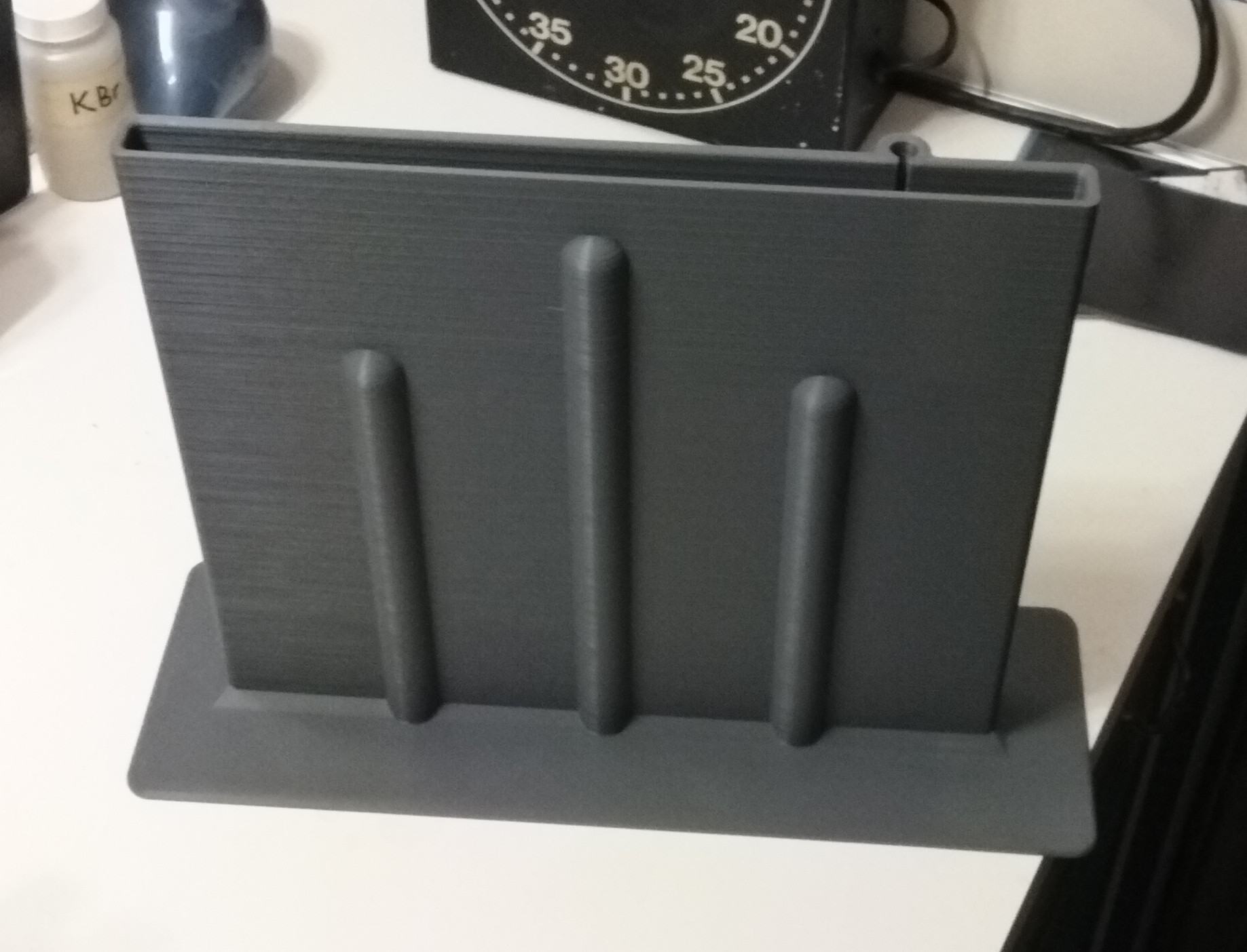 I cooked this up for my own use so I could develop my 2-sided X-ray film without the scratches you get in a tray. Knowing I would be using Rodinal 1:100, the math worked out to be 7cc Rodinal in 700cc water or therabouts. But there is no reason why the tank won't be just as good for standard film and chemistry. It only develops 1 sheet at a time, but that's what most of us would be doing with trays anyway. I sized it for my Kodak 8x10 hangers to just fit. I suppose other brands of hangers would do fine too. This one was a bit of a toughie. But on the third try I had all the bugs worked out and it turned out perfect. The big ribs you see are to stop the bowing of the tank walls exhibited on my second failure that had no ribs. The first one leaked. BTW, notice the tube on the end for a glass thermometer to slip in and actually be immersed in the liquid. Follow these instructions carefully, as my Neptune 4 Max does better layers when printing long items turned front to back of the print bed. Instructions: Use PLA. Turn down print speed to no more than 200mm/sec. Turn heat up to 210C. Fan at 50%. Infill 50%. Bed, 60C, No support. The job wil take 39 hours and use about 2/3 of a roll of filament. Shield printer from drafts. Be absolutely sure the printer is in proper adjustment. If out of adjustment, or cold drafts you'll end up with a leaky tank from poor layer adhesion.. I increased the wall thickness to 1.2mm from the default .8mm to help abate that problem. This is an stl, not a gcode, so you can use your own slicer. I used Cura with .4mm nozzle