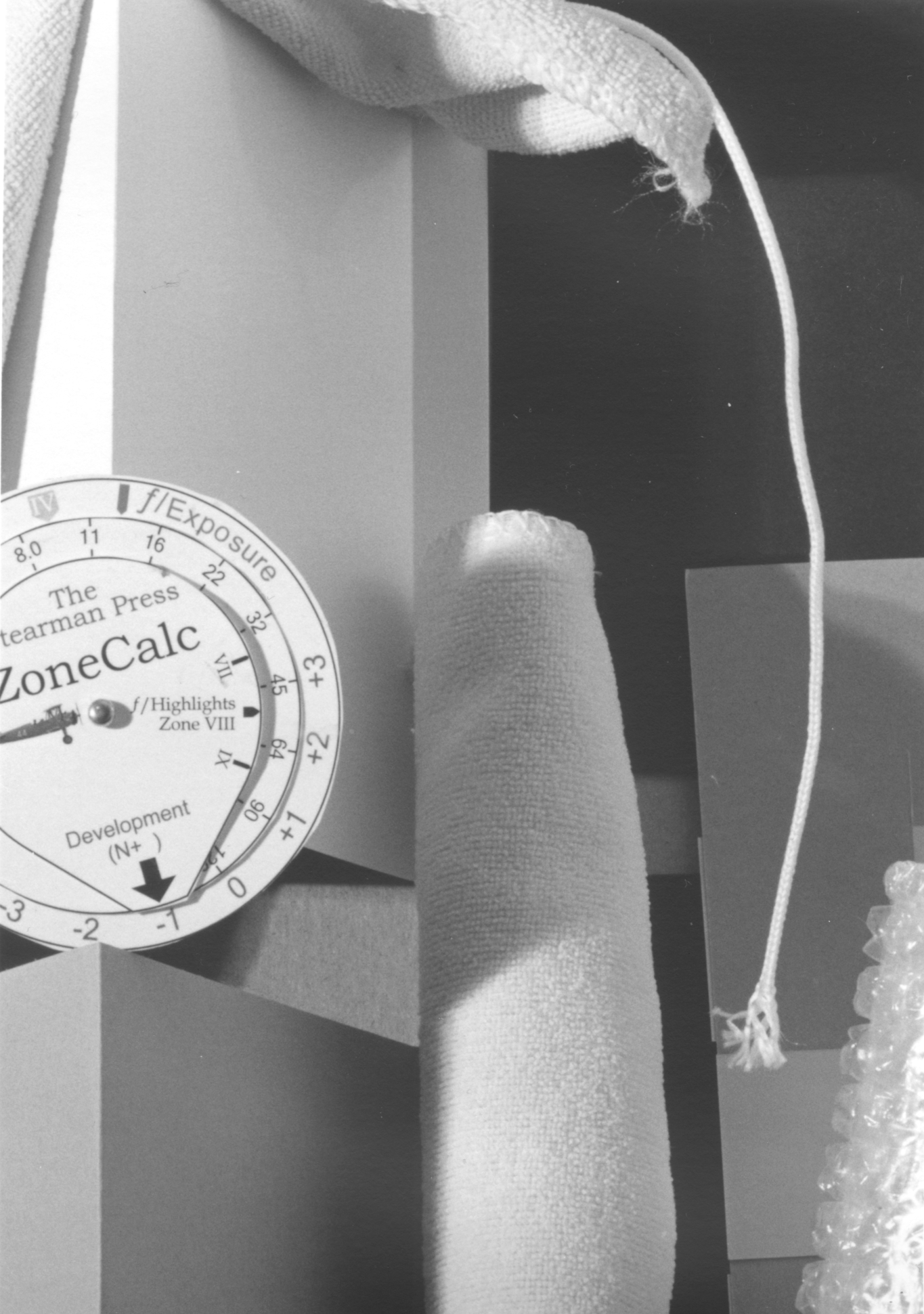 Guess what. Examining the prints close-up by eye, I can barely tell which is which. Only in the type on the little card can I sense that the f/45 images is not quite a sharp. The small, serif type, 8- or 9-point, is in the range of 1/64-inch high on the negative—all perfectly clear in the prints. But what really wiped away any doubt, is that some fine, individual hairs frayed from a microfiber cloth are also clearly visible. Remember that I’m staring from about six inches at a teency-tiny area on what would be a 20x24 print. I hope the scans will at least indicate what is visible in the prints. (By the way, I applied no sharpening to the scans and only adjusted the black point slightly since they are on semi-matte paper.)
