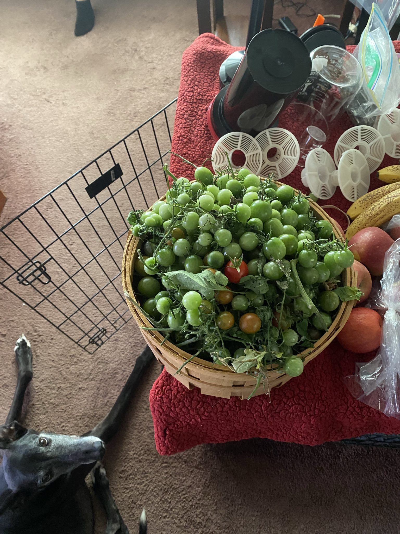 Last night was the first frost so I picked as many green tomatoes as I could. Now I need a recipe for them. Probably won't be able to eat them all.