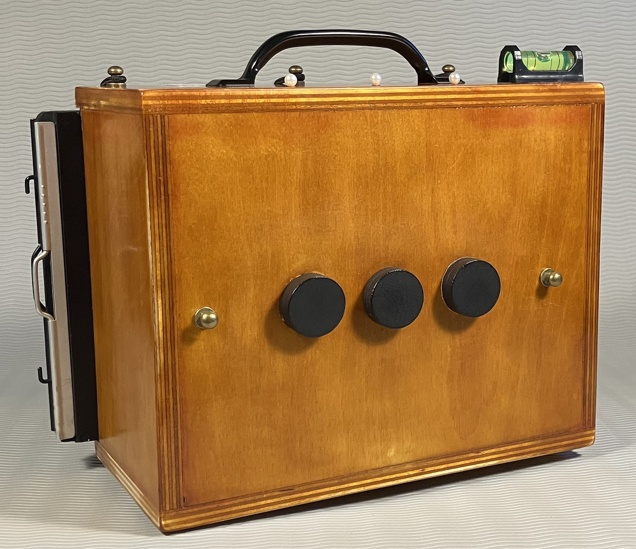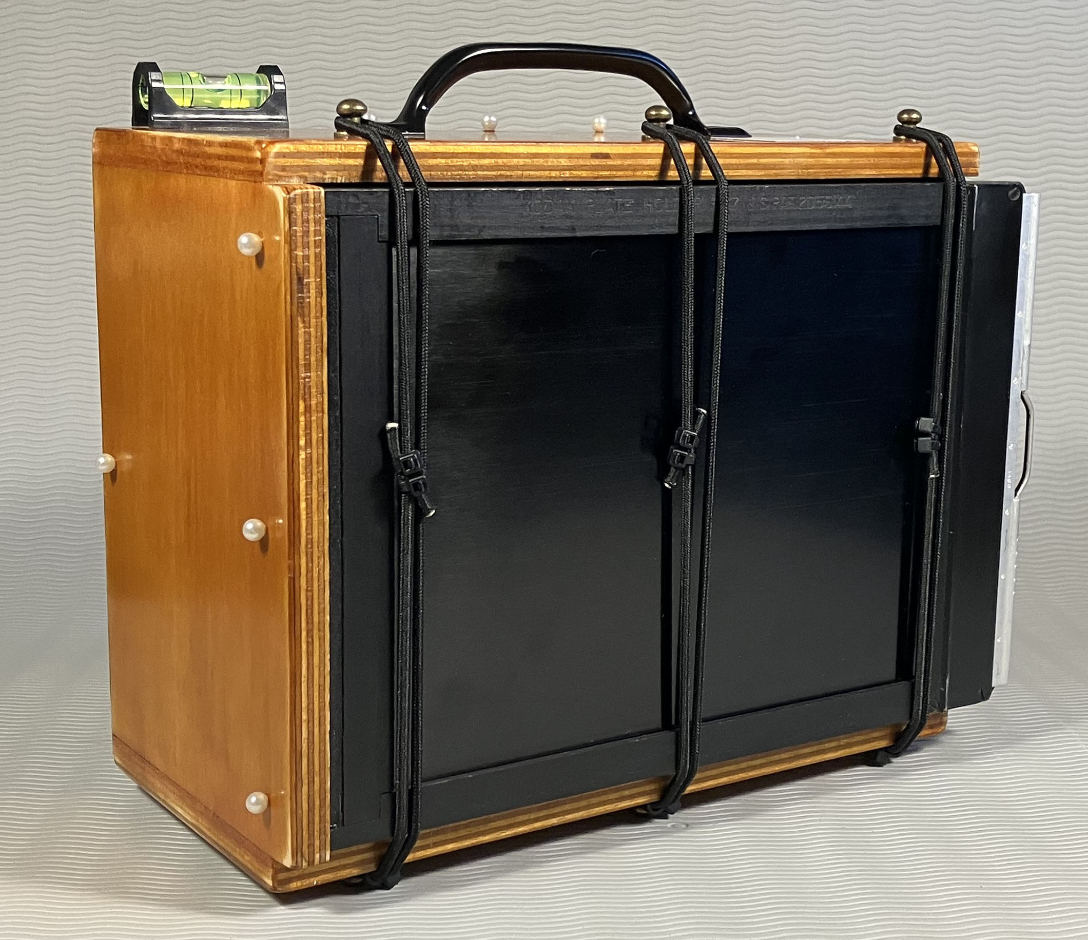 Front view of the camera with pinhole caps in place.