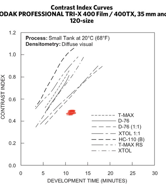 Red dot is what you got… this doesn’t have D-23 1:1 but suppose the time-contrast curve is parallel to D-76 1:1 and knowing what you got, I would try 16 minutes next time.