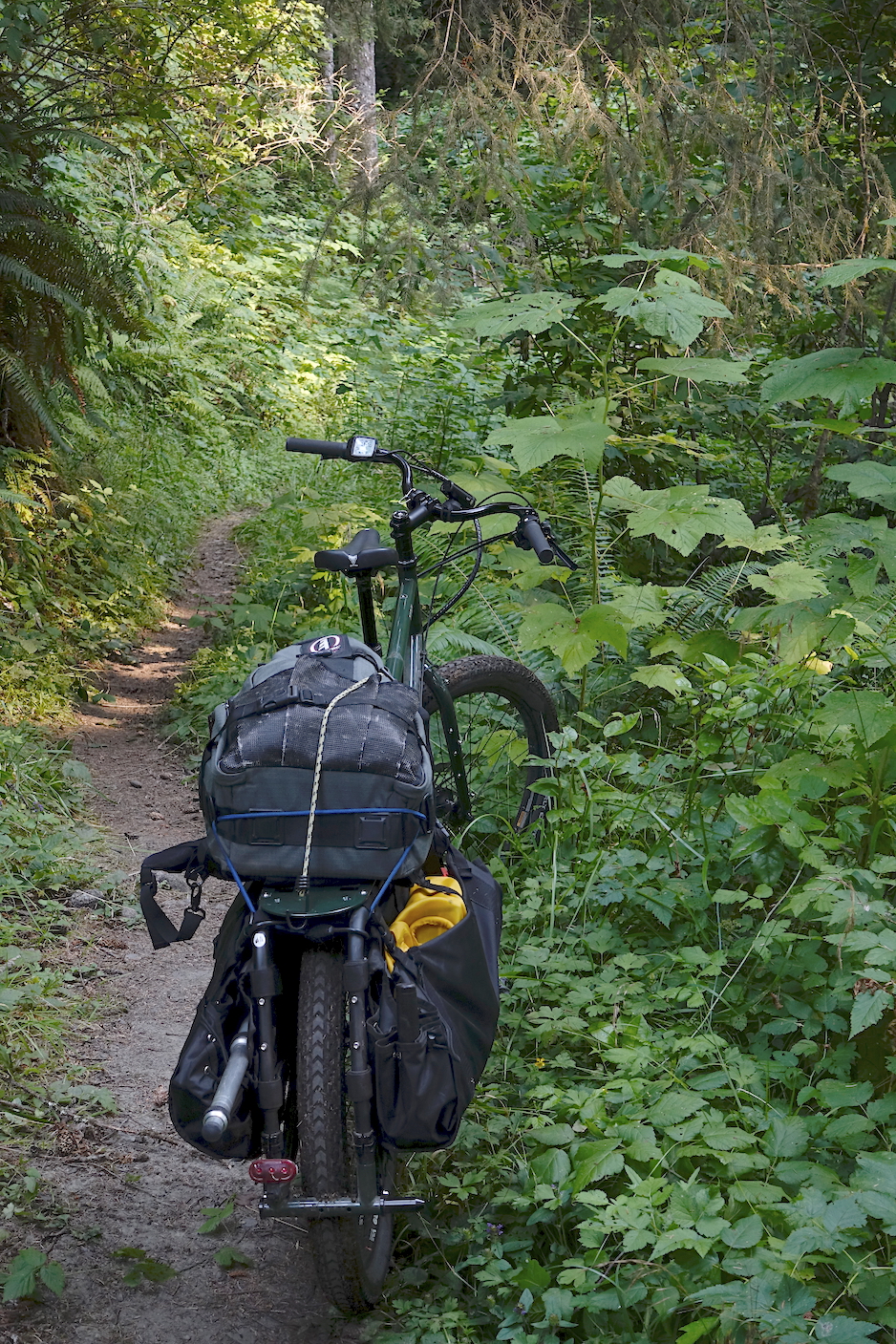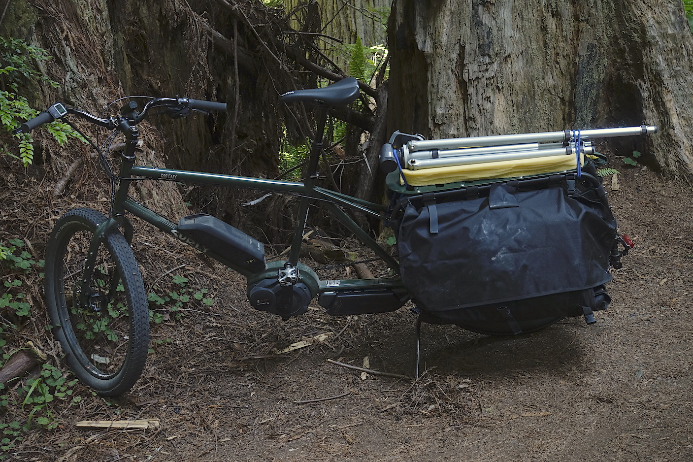 Surley's Big Easy. A longtail cargo bike (400lbs load limit). Images below of it loaded with the 5x7 for the first exploration (25 mile ride, about 2/3 single track, 1/3 dirt and paved road). Had the camera in a side pannier, but too big a risk of whacking it against a tree, then I put the camera pack on top rack, with tripod on the side...better and easier access.