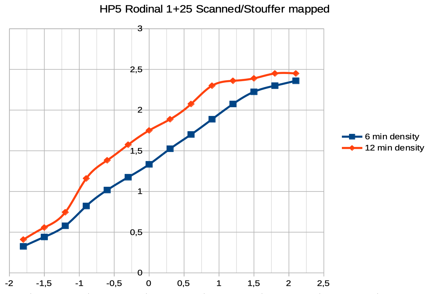 By determining a development model for your printing conditions, you can determine the printing time for any required contrast. For the record, determining a development model isn't as straight forward as it might first appear. As I said before, the curve is dependent on the film / developer / development combination. Here is the same film developed in two different developers.