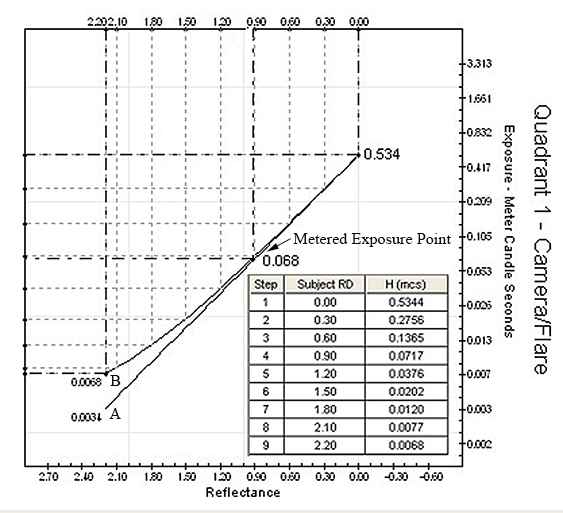 The example below is of the camera image. It's from a statistically average 2.20 log Luminance range. Curve A is a no flare curve used as a reference. Curve B is the camera image curve with one stop of flare. Flare is non-image forming light created mostly by the higher illuminance values interacting with the optical system and camera. Flare is mostly produced by the subject. Even though the exposure covers the entire negative, it disproportionately affects the shadows. One stop of flare means the value of the exposure for the shadow is added to the overall exposure. This doubles the shadow exposure (one stop) yet has a negligible affect on the highlight exposure. The metered exposure is only slightly influence by flare.