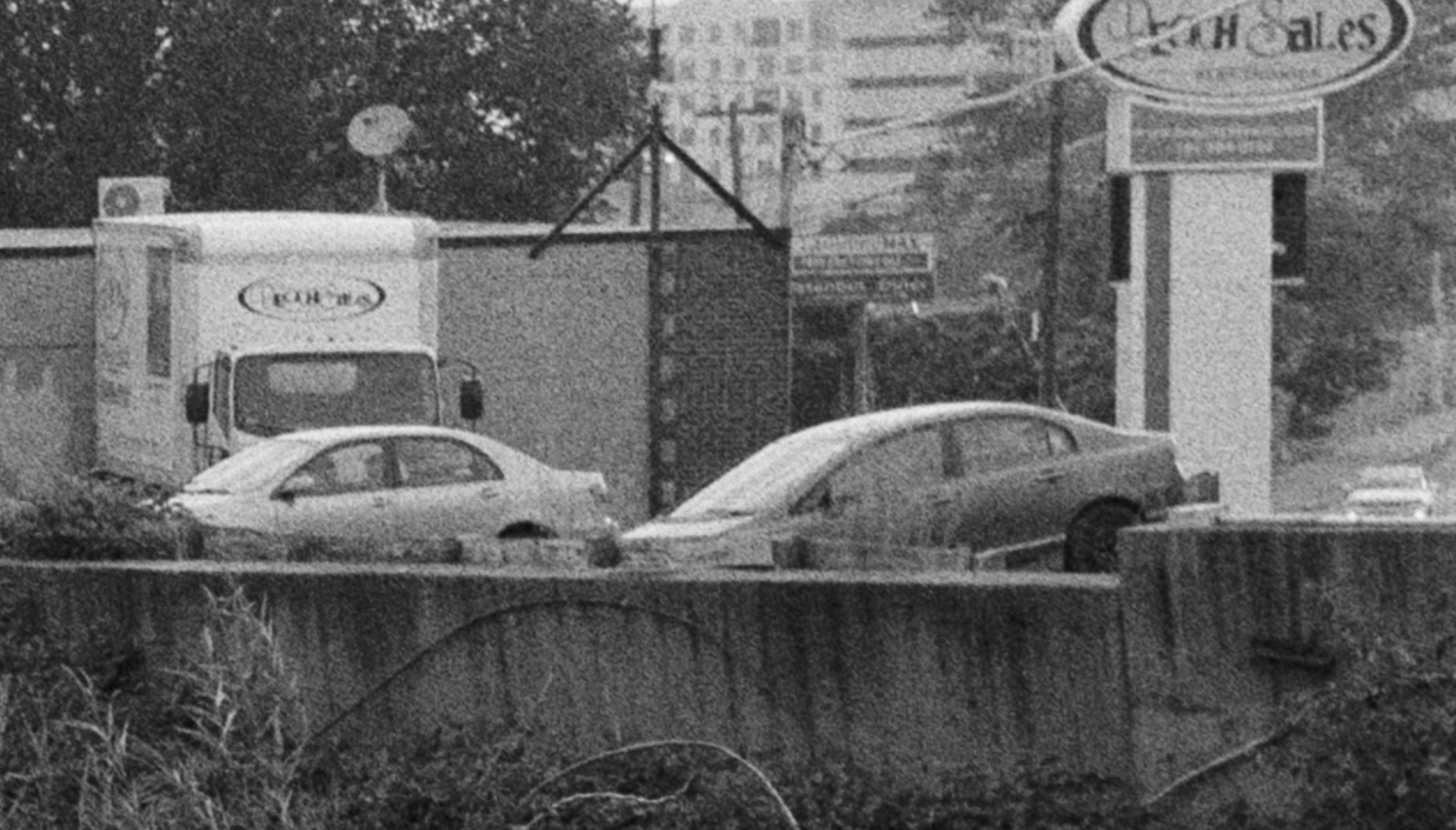 Focus was on the bush in the center of the shot. Either f/5.6 or f/8, I don't remember. The tree on the left is quite a bit closer than the cars on the right, but the cars on the right are in nearly perfect focus and the tree is way out.