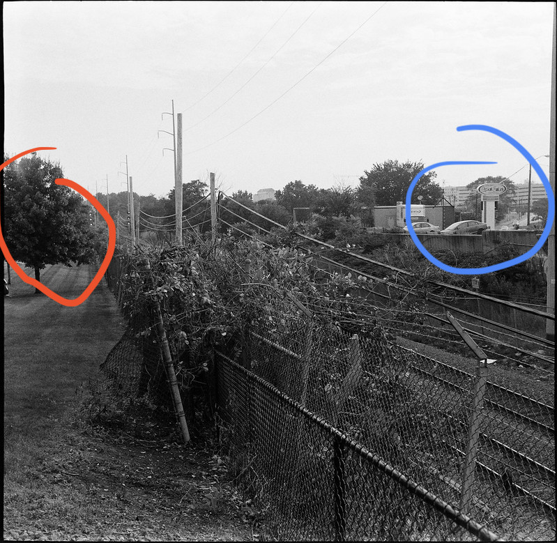 The left example is from the extreme edge of the film plane and the other a bit further in. Grass and leaves are also a bit more ambiguous too WRT contrast. Both due to the diffuse lighting and the colours that are quite close.I think they're all a bit topographically hard to figure out! The railroad fence is definitely the obvious candidate, though.
