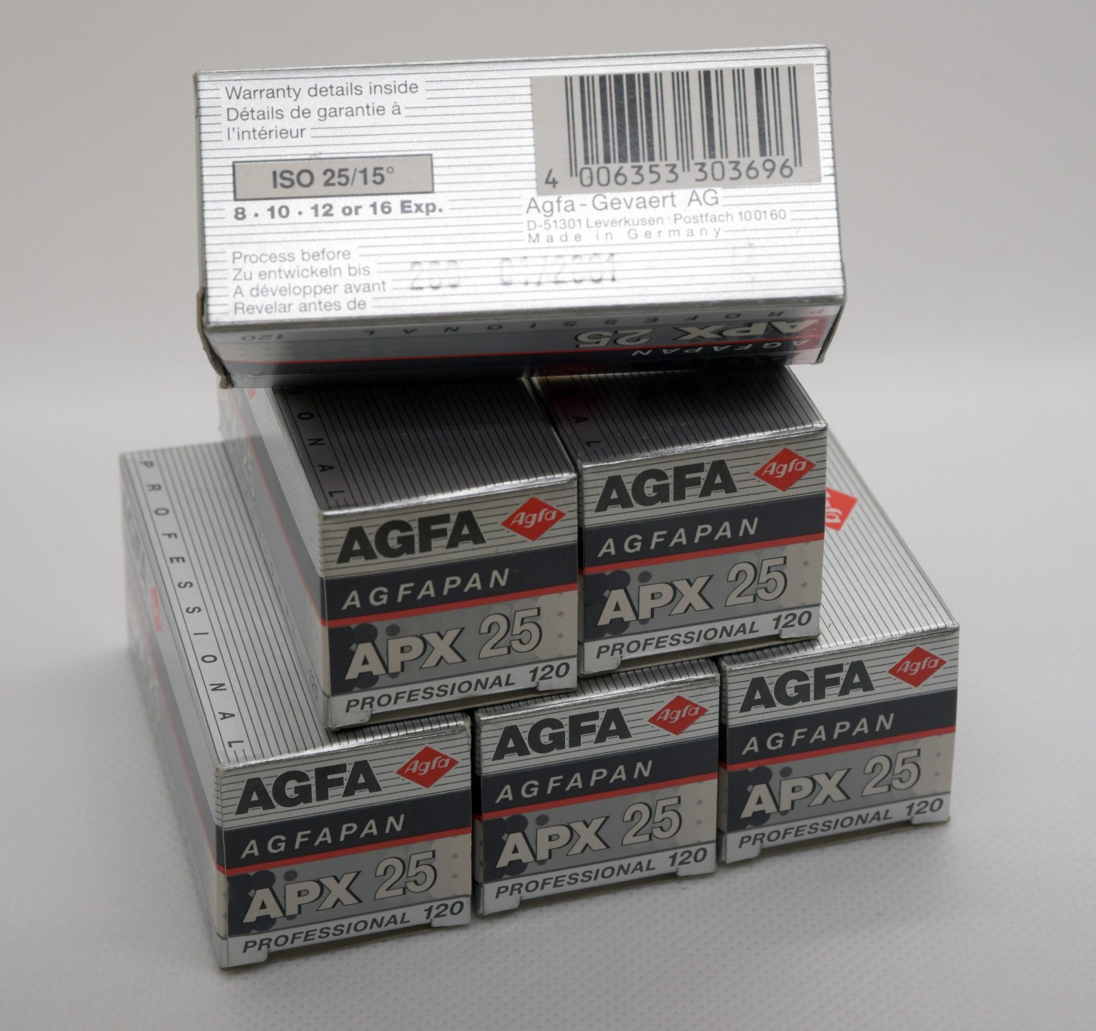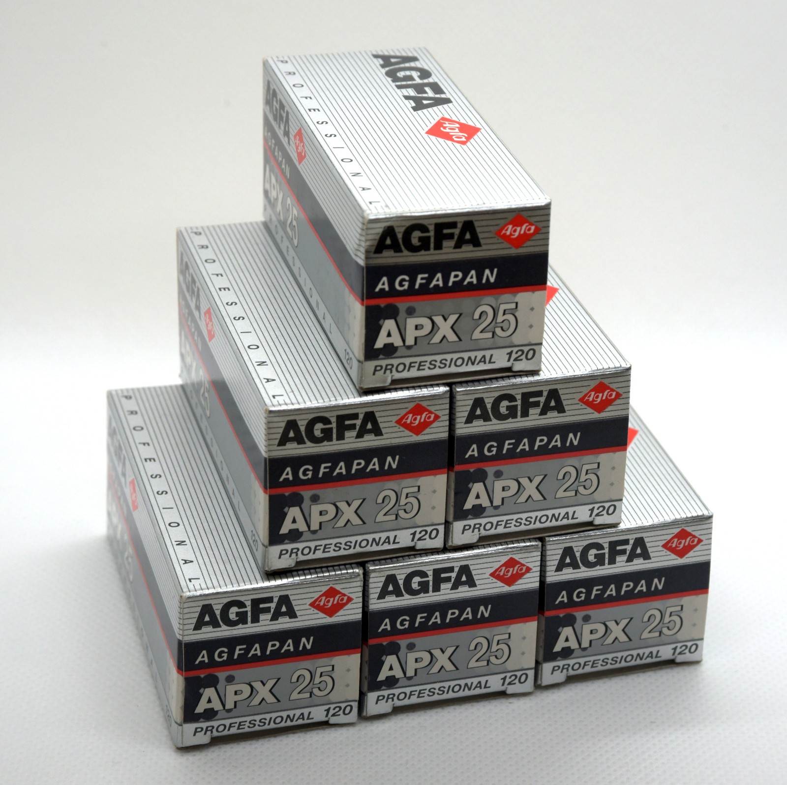 6 rolls of Agfapan APX25, Professional 120 size...New in box but EXPIRED 01/2001. All same emulsion batch. I have not shot a test roll, so these are being sold AS-IS, I have no information on condition or viability. Sorry, no returns. Also selling similar 6 rolls 135-36... $100 plus $8 shipping... Sorry, USA Only