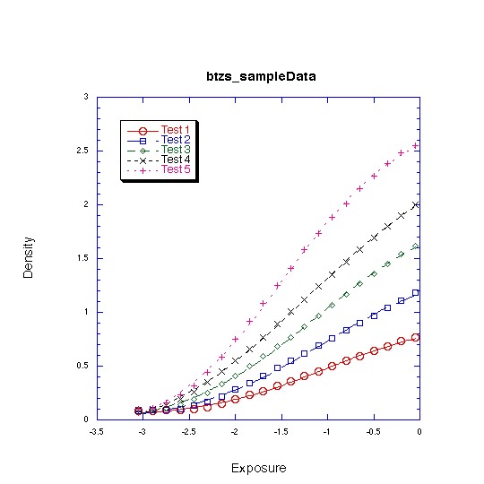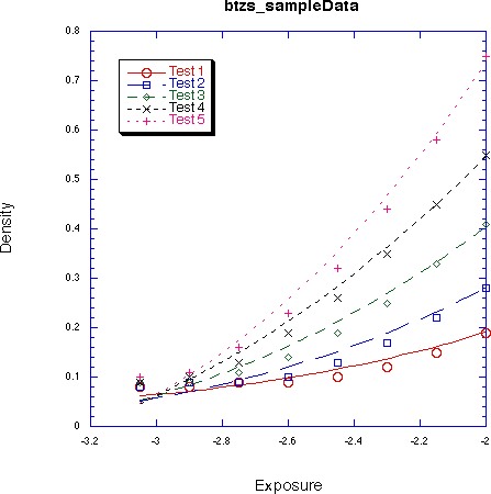 The paragraph above implies that the optimal functions are probably not polynomials or cubic splines. Those functions do not have a shape that naturally mimics the shape of a characteristic curves, and they will require you to use more adjustable parameters than if you started with more suitable curves. Furthermore, you are more likely to encounter "pathalogical" behaviors with those functions. Polynomials are especially bad in this regard, and can often produce poor results for data having asymptotic tails (like the toe of the characteristic curve) and noise. What can happen is that in order to get an apparently good fit to the data you will have to use a high order polynomial, and then your equation may tend to have wild oscillations between the data points and in the range outside the data. In fact, I can guarantee you that a finite order polynomial will not fit the toe-end of the curve if you were to extend it to zero exposure.